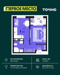 Продается студия площадью 33.6 кв. м. на 5 этаже 9 этажного дома, 1 подъезд, номер 41. Стоимость данного лота включает в себя ремонт, мебель и технику. Будут представлены 3 варианта обустройства квартиры: светлый, тонированный и авторский. Для более подробного ознакомления вы можете обратиться в отдел продаж. Жилой комплекс ''ИНАЧЕ в Молодежном'' включает в себя 14 домов комфорт+ класса переменной этажности с более чем 100 видами планировок, в том числе квартиры с террасами, двухуровневые квартиры и урбан виллы, детский сад на 350 мест, храм, 2 наземных паркинга, а также бульвар и прогулочные аллеи. Срок сдачи первой очереди 4 квартал 2026 года Жилой комплекс находится в Молодежном — тихом микрорайоне с атмосферой размеренной жизни. Рядом расположен зеленый сквер ''Изумрудный'' с зелеными деревьями и велодорожками. Молодежный — молодой район с готовой инфраструктурой. Всю бытовую и семейную можно легко организовать на расстоянии 10 минут от дома. Есть новая школа, два детских сада, поликлиника, работают магазины, аптеки и салоны красоты. Жилой комплекс расположен рядом с удобными выездами на ключевые городские дороги. Можно быстро доехать как в центр города, так и до моря по Ейскому шоссе. Главные чувства от прогулки по нашему району простота и легкость. Архитектуру мы проработали совместно с архитектурным бюро Маликова и создали район с современным лаконичным обликом. При этом мы учли сценарии жизни людей и современные тренды. В наших домах будут разноэтажные секции. Французские балконы и увеличенные окна. На фасадах не будет визуального шума: кондиционеры будут скрыты с специальных корзинах. По всей территории продумана безбарьерная сеть тротуаров и переходов. Любое перемещение — пешком или с коляской — станет комфортным. - На территории комплекса будут расположены детские и спортивные площадки, а также амфитеатр, арт-объект и храм. - 40% территории занимает озеленение с более чем 50 видами растений. - Хранить автомобиль с комфортом и беречь его от осадков помогут два наземных многоуровневых паркинга. Кроме крытых паркингов, на территории есть открытые — в достаточном числе для жителей и гостей района. - Проект включает в себя строительство современного детского сада и так же в пешей доступности находятся 2 школы. - На первых этажах мы создадим коммерческие помещения с планировками, которые помогают бизнесу. Умный проект коммерции включает удобные входные группы, высокие потолки и панорамные окна, приглашающие заглянуть внутрь. - Эстетика холла продолжает природную идею района. Дизайнерские холлы выполненные в натуральных цветах с живыми деревьями включают в себя места для ожидания, встреч, санузлы, колясочные и постаматы. - Система аудиомультирум в каждой квартир - распределение аудио- и видео-сигналов по всей квартире. Для более подробного ознакомления вы можете обратиться в отдел продаж.