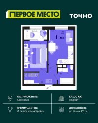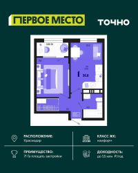 Продаётся 1-комнатная квартира в сданном доме (Литер 5), срок сдачи: IV-кв. 2023, общей площадью 36.78 кв.м., на 10 этаже. Расположение, транспортная доступность Жилой комплекс ''Оникс'' возводится в спокойном, благоустроенном районе с благоприятной экологической обстановкой. ЖК строится внутри заселенного квартала, шум магистралей новоселов не потревожит. С другой стороны, крупные дорожные артерии района - улицы Российская, Московская, Петра Мельникова - находятся совсем недалеко, и у ЖК имеются к ним удобные выезды. Например, дорога до центральных кварталов на машине займет около двадцати минут. В пяти минутах ходьбы от нового ЖК расположена остановка ''Топольковский переулок'', от которой на автобусе можно доехать до центра менее чем за полчаса. В целом транспортная доступность жилого комплекса оценивается как очень хорошая. Удобные транспортные развязки, остановки автобусов и маршрутных такси, которые регулярно курсируют в разных направлениях, позволят новоселам без проблем добираться в любой район Краснодара. Инфраструктура В микрорайоне, где строится ЖК ''Оникс'', сложившаяся сеть инфраструктуры, все необходимое для комфортной жизни расположено недалеко от дома. В округе большой выбор продуктовых магазинов: ''Репка'', где продаются свежие овощи и фрукты, ''Агрокомплекс'', ''Магнит'', ''Пятерочка'', ''Лучезарный'' (с собственной кулинарией). За несколько минут можно дойти до гипермаркета ''Лента''. В десяти минутах ходьбы расположены: два крупных торговых комплекса - ''Стрелка'' и ''Мандарин'', аптеки, отделения банков, магазины мебели и товаров для дома, тренажерный зал, несколько фитнес-центров и салонов красоты, ветеринарная клиника ''Любимый питомец''. В шаговой доступности много кафе и ресторанов на любой вкус: пиццерия Like Pizza с услугой доставки еды, суши-бар Food-Zone, ресторан ''Джентльмен'', бар Lounge-pub Blacksmith, кофейня N Coffee. В районе работают поликлиники и больницы для взрослых и детей, стоматология ''М-Клиник''. Пешком от жилого комплекса можно дойти до детских садов ''Бэмби'', ''Вишенка'', центров развития ребенка ''Мишутка'', ''Волшебная страна'', ''Ёжик ДИН'', центра развития и клуба для детей и подростков ''Стрижи'', общеобразовательных школ. Ближайшая к дому школа (в пяти минутах ходьбы) - престижная гимназия ''Лидер''. Надежность застройщика Проект реализует СК ''Капитал Инвест'', основанная в 2003 году, стабильная и надежная организация, входящая в ТОП-5 крупнейших девелоперов Южного федерального округа. В штате ''Капитал Инвест'' более тысячи опытных сотрудников, постоянно повышающих квалификацию. Компания стремится к оптимальному сочетанию лучших традиций градостроительства и новейших разработок в сфере девелопмента. СК выполняет практически весь цикл работ: занимается созданием архитектурных проектов, строительством, дизайном, а также реконструкцией зданий. ''Капитал Инвест'' пользуется заслуженным доверием коллег, экспертов и покупателей, сотрудничает с крупными финансовыми организациями. Квартиру в жилом комплексе ''Оникс'' можно приобрести в
