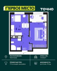 Продается 1 комнатная квартира площадью 37.99 кв. м. на 2 этаже 18 этажного дома, 1 подъезд, номер 11. Стоимость данного лота включает в себя ремонт, мебель и технику. Будут представлены 3 варианта обустройства квартиры: светлый, тонированный и авторский. Для более подробного ознакомления вы можете обратиться в отдел продаж. Жилой комплекс ''ИНАЧЕ в Молодежном'' включает в себя 14 домов комфорт+ класса переменной этажности с более чем 100 видами планировок, в том числе квартиры с террасами, двухуровневые квартиры и урбан виллы, детский сад на 350 мест, храм, 2 наземных паркинга, а также бульвар и прогулочные аллеи. Срок сдачи первой очереди 4 квартал 2026 года Жилой комплекс находится в Молодежном — тихом микрорайоне с атмосферой размеренной жизни. Рядом расположен зеленый сквер ''Изумрудный'' с зелеными деревьями и велодорожками. Молодежный — молодой район с готовой инфраструктурой. Всю бытовую и семейную можно легко организовать на расстоянии 10 минут от дома. Есть новая школа, два детских сада, поликлиника, работают магазины, аптеки и салоны красоты. Жилой комплекс расположен рядом с удобными выездами на ключевые городские дороги. Можно быстро доехать как в центр города, так и до моря по Ейскому шоссе. Главные чувства от прогулки по нашему району простота и легкость. Архитектуру мы проработали совместно с архитектурным бюро Маликова и создали район с современным лаконичным обликом. При этом мы учли сценарии жизни людей и современные тренды. В наших домах будут разноэтажные секции. Французские балконы и увеличенные окна. На фасадах не будет визуального шума: кондиционеры будут скрыты с специальных корзинах. По всей территории продумана безбарьерная сеть тротуаров и переходов. Любое перемещение — пешком или с коляской — станет комфортным. - На территории комплекса будут расположены детские и спортивные площадки, а также амфитеатр, арт-объект и храм. - 40% территории занимает озеленение с более чем 50 видами растений. - Хранить автомобиль с комфортом и беречь его от осадков помогут два наземных многоуровневых паркинга. Кроме крытых паркингов, на территории есть открытые — в достаточном числе для жителей и гостей района. - Проект включает в себя строительство современного детского сада и так же в пешей доступности находятся 2 школы. - На первых этажах мы создадим коммерческие помещения с планировками, которые помогают бизнесу. Умный проект коммерции включает удобные входные группы, высокие потолки и панорамные окна, приглашающие заглянуть внутрь. - Эстетика холла продолжает природную идею района. Дизайнерские холлы выполненные в натуральных цветах с живыми деревьями включают в себя места для ожидания, встреч, санузлы, колясочные и постаматы. - Система аудиомультирум в каждой квартир - распределение аудио- и видео-сигналов по всей квартире. Для более подробного ознакомления вы можете обратиться в отдел продаж.
