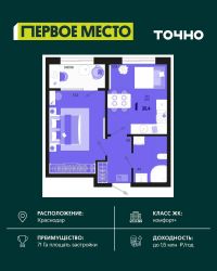 1-комнатная квартира с отапливаемой лоджией в жилом комплексе Зеленая территория от надежного застройщика СЗ Флагман в Краснодаре.Покупка квартиры в ЖК Зелёная территория это : дворы без машин с большими детскими площадками, баланс природы и городской среды, библиотека, конгресс-центр, фитнес-центр,много парковочных мест, наземная многоуровневая парковка,выделенная велосипедная дорожка на длинной прогулочной аллее в собственном закрытом от посторонних парке,зарядные станции для автомобилей,спортивные площадки для детей и взрослых,собственный парк на территории комплекса - 1,2 Га,ТРК Красная площадь, Леруа Мерлен - 10 минут на машине,школа в 2 минутах ходьбы от дома,3 минуты до детского сада,рядом находятся ледовый дворец Iсе Раlасе, спортивный комплекс ''Баскет Холл'', школа ЦСК и теннисные корты,выезд на Ейское шоссе - дорога на море за час без пробок.За более чем 20 лет группа компаний Флагман построила: 9 ЖК, 4 200 квартир24 многоэтажных дома2 коттеджных посёлка7 коммерческих БЦ Подберите 1-комнатную квартиру по вашим параметрам в ЖК Зелёная территория от застройщика СЗ Флагман. Звоните или нажимайте Заказать звонок - мы сформируем подборку планировок, просчитаем стоимость ежемесячного платежа и пришлем вам.