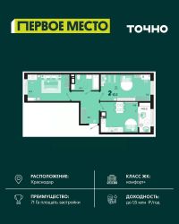 Продаётся 2-комнатная квартира в сданном доме (Литер 4), срок сдачи: III-кв. 2022, общей площадью 54.65 кв.м., на 14 этаже. Расположение, транспортная доступность Жилой комплекс ''Оникс'' возводится в спокойном, благоустроенном районе с благоприятной экологической обстановкой. ЖК строится внутри заселенного квартала, шум магистралей новоселов не потревожит. С другой стороны, крупные дорожные артерии района - улицы Российская, Московская, Петра Мельникова - находятся совсем недалеко, и у ЖК имеются к ним удобные выезды. Например, дорога до центральных кварталов на машине займет около двадцати минут. В пяти минутах ходьбы от нового ЖК расположена остановка ''Топольковский переулок'', от которой на автобусе можно доехать до центра менее чем за полчаса. В целом транспортная доступность жилого комплекса оценивается как очень хорошая. Удобные транспортные развязки, остановки автобусов и маршрутных такси, которые регулярно курсируют в разных направлениях, позволят новоселам без проблем добираться в любой район Краснодара. Инфраструктура В микрорайоне, где строится ЖК ''Оникс'', сложившаяся сеть инфраструктуры, все необходимое для комфортной жизни расположено недалеко от дома. В округе большой выбор продуктовых магазинов: ''Репка'', где продаются свежие овощи и фрукты, ''Агрокомплекс'', ''Магнит'', ''Пятерочка'', ''Лучезарный'' (с собственной кулинарией). За несколько минут можно дойти до гипермаркета ''Лента''. В десяти минутах ходьбы расположены: два крупных торговых комплекса - ''Стрелка'' и ''Мандарин'', аптеки, отделения банков, магазины мебели и товаров для дома, тренажерный зал, несколько фитнес-центров и салонов красоты, ветеринарная клиника ''Любимый питомец''. В шаговой доступности много кафе и ресторанов на любой вкус: пиццерия Like Pizza с услугой доставки еды, суши-бар Food-Zone, ресторан ''Джентльмен'', бар Lounge-pub Blacksmith, кофейня N Coffee. В районе работают поликлиники и больницы для взрослых и детей, стоматология ''М-Клиник''. Пешком от жилого комплекса можно дойти до детских садов ''Бэмби'', ''Вишенка'', центров развития ребенка ''Мишутка'', ''Волшебная страна'', ''Ёжик ДИН'', центра развития и клуба для детей и подростков ''Стрижи'', общеобразовательных школ. Ближайшая к дому школа (в пяти минутах ходьбы) - престижная гимназия ''Лидер''. Надежность застройщика Проект реализует СК ''Капитал Инвест'', основанная в 2003 году, стабильная и надежная организация, входящая в ТОП-5 крупнейших девелоперов Южного федерального округа. В штате ''Капитал Инвест'' более тысячи опытных сотрудников, постоянно повышающих квалификацию. Компания стремится к оптимальному сочетанию лучших традиций градостроительства и новейших разработок в сфере девелопмента. СК выполняет практически весь цикл работ: занимается созданием архитектурных проектов, строительством, дизайном, а также реконструкцией зданий. ''Капитал Инвест'' пользуется заслуженным доверием коллег, экспертов и покупателей, сотрудничает с крупными финансовыми организациями. Квартиру в жилом комплексе ''Оникс'' можно приобрести