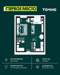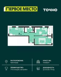 Продаётся 2-комнатная квартира в сданном доме (Дом 33Г), срок сдачи: IV-кв. 2022, общей площадью 68.7 кв.м., на 6 этаже. Development Plaza - мультиформатный проект, где качественная фундаментальная архитектура создает атмосферу успеха и вдохновения. Новый центр жилой и деловой активности. Здесь нужного вам бизнес-партнера гораздо проще встретить в ресторане, чем несколько недель искать его контакты через знакомых - скорее всего, он ваш сосед. Архитектура Фасад из травертина. Выполнен по индивидуальному проекту. Синтез архитектурных стилей привнес в Development Plaza европейскую атмосферу. Эксклюзив Окна в пол, окна в ванной, высокие потолки 3.6 м, студии, келлеры и роскошные 4-комнатные квартиры. Вариативность планировок и деталей - одна из уникальных характеристик Development Plaza. Play-zone спорт йога кинозал гамаки скалодром Свобода от границ Внутренний двор дома расположен на третьем уровне здания. Здесь созданы пространства для отдыха, творчества и впечатлений. Все спроектировано таким образом, чтобы дети росли здоровыми. Нетворкинг Жить в Development Plaza - значит быть частью большой истории, постоянно развивать собственные способности и строить нетворкинг в среде креативного класса и бизнес-элиты. Development Plaza органично сочетает в себе деловую и жилую среду. Достаточно двух минут, чтобы сменить домашнюю атмосферу на яркие ощущения от событий и перспективных знакомств. Премиальные холлы Уникальный авторский дизайн, дорогие натуральные материалы в отделке. Элементы системы умный дом для поддержания комфорта в местах общего пользования. Lounge-зона в каждом подъезде. Стойка консьерж-службы. Колясочные. Помещение для мойки лап питомцам. Квартиры Число квартир - 260. Широкая квартирография - от студий до 4 комнатных квартир евроформата. Высота потолков - 3,6 метра , возможность устройства 2го уровня в одной квартире. Предусмотрены варианты объединения квартир до 180 кв.м. Уникальные видовые характеристики. Квартиры с видом на Чистяковскую рощу, стадион Краснодар, центр города, в квартирах на юго-восточную сторону видно горы в ясную погоду! Квартиры на 3 стороны света! Некоторые квартиры имеют большое видовое окно в ванной комнате. Высокая обеспеченность квартир келлерами- современными европейскими местами для хранения. Большие панорамные окна. Высота окон во всех квартирах - 2,3 м. На трех верхних этажах окна имеют остекление в пол Во всех квартирах остекление из комнат на лоджию полностью в пол, отопительные приборы убраны на стены рядом Дизайн-проект в подарок всем покупателям. Инновации и безопасность В комплексе трехуровневый подземный паркинг на 263 машиноместа с возможностью спуститься к автомобилю на лифте. Система интеллектуального управления при въезде на территорию комплекса обеспечивает доступ в паркинг только для своих. Современные технологии безопасности на основе интегрированной IP-системы позаботятся о спокойствии жителей Development Plaza. В комплексе поэтажный контроль досту