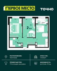 Продаётся 2-комнатная квартира в сданном доме (Дом 33Г), срок сдачи: IV-кв. 2022, общей площадью 64.9 кв.м., на 4 этаже. Development Plaza - мультиформатный проект, где качественная фундаментальная архитектура создает атмосферу успеха и вдохновения. Новый центр жилой и деловой активности. Здесь нужного вам бизнес-партнера гораздо проще встретить в ресторане, чем несколько недель искать его контакты через знакомых - скорее всего, он ваш сосед. Архитектура Фасад из травертина. Выполнен по индивидуальному проекту. Синтез архитектурных стилей привнес в Development Plaza европейскую атмосферу. Эксклюзив Окна в пол, окна в ванной, высокие потолки 3.6 м, студии, келлеры и роскошные 4-комнатные квартиры. Вариативность планировок и деталей - одна из уникальных характеристик Development Plaza. Play-zone спорт йога кинозал гамаки скалодром Свобода от границ Внутренний двор дома расположен на третьем уровне здания. Здесь созданы пространства для отдыха, творчества и впечатлений. Все спроектировано таким образом, чтобы дети росли здоровыми. Нетворкинг Жить в Development Plaza - значит быть частью большой истории, постоянно развивать собственные способности и строить нетворкинг в среде креативного класса и бизнес-элиты. Development Plaza органично сочетает в себе деловую и жилую среду. Достаточно двух минут, чтобы сменить домашнюю атмосферу на яркие ощущения от событий и перспективных знакомств. Премиальные холлы Уникальный авторский дизайн, дорогие натуральные материалы в отделке. Элементы системы умный дом для поддержания комфорта в местах общего пользования. Lounge-зона в каждом подъезде. Стойка консьерж-службы. Колясочные. Помещение для мойки лап питомцам. Квартиры Число квартир - 260. Широкая квартирография - от студий до 4 комнатных квартир евроформата. Высота потолков - 3,6 метра , возможность устройства 2го уровня в одной квартире. Предусмотрены варианты объединения квартир до 180 кв.м. Уникальные видовые характеристики. Квартиры с видом на Чистяковскую рощу, стадион Краснодар, центр города, в квартирах на юго-восточную сторону видно горы в ясную погоду! Квартиры на 3 стороны света! Некоторые квартиры имеют большое видовое окно в ванной комнате. Высокая обеспеченность квартир келлерами- современными европейскими местами для хранения. Большие панорамные окна. Высота окон во всех квартирах - 2,3 м. На трех верхних этажах окна имеют остекление в пол Во всех квартирах остекление из комнат на лоджию полностью в пол, отопительные приборы убраны на стены рядом Дизайн-проект в подарок всем покупателям. Инновации и безопасность В комплексе трехуровневый подземный паркинг на 263 машиноместа с возможностью спуститься к автомобилю на лифте. Система интеллектуального управления при въезде на территорию комплекса обеспечивает доступ в паркинг только для своих. Современные технологии безопасности на основе интегрированной IP-системы позаботятся о спокойствии жителей Development Plaza. В комплексе поэтажный контроль досту