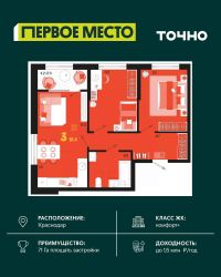 Жилой район ''Первое место''- один из самых масштабных проектов в России. На территории 71 га 18 кварталов, 31 дом переменной этажности от 8 до 18 этажей, собственный парк 9 га, храмовый комплекс, пешеходный бульвар ''Круг семьи'', детские и спортивные площадки, мангальные зоны и различные локации для отдыха. В шаговой доступности действующие муниципальные образовательные учреждения: школа на 1 100 мест и детский сад на 250 мест. Помимо этого, в жилом районе ''Первое место'' построятся школа на 1700 мест с крытым 25-метровым бассейном и 5 детских садов на 1 490 мест. На первых этажах многоуровневых парковок ''паркхабов'' разместится более 61 тыс м2 коммерческих помещений. Жителям будут доступны собственный фитнес-центр, кафе, рестораны и магазины. В каждом подъезде предусмотрены дизайнерские холлы в стиле лобби отелей, консьерж-сервис, лапомойки, отдельные колясочные и велосипедные. Также в домах будут просторные кладовые помещения и комнаты для хранения почты с почтоматами для получения посылок из маркетплейсов.