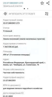 В самом близости от города-курорта Анапа, хутор Чембурка, ровный земельный участок общей площадью 4,94 сотки с фасадом 27 метра.Назначение участка - для ведения личного подсобного хозяйства, кадастровый номер 23:37:0802001:273Участок угловой, два фасада, что дает возможность правильной проектировки дома при строительстве с возможностью рационального использования площади и расположения.Дорога к участку ровная, отсыпанная гравием. Коммуникации: свет 15 кВт, газ по меже.В поселке есть продуктовые и строительные магазины, почта, дом культуры. Удобная транспортная развязка дает возможность без пробок выехать в любую точку района.Без долгов и обременений, любые виды расчета . Возможна семейная ипотека ! По всем вопросам готов ответить по телефону и личной встрече, звоните !Арт. 128130613