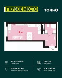 Продаётся студия в сданном доме (Дом 12 Корпус 8), срок сдачи: IV-кв. 2023, общей площадью 26.3 кв.м., на 4 этаже. Микрорайон ''Красная площадь'' - новый, перспективный, масштабный, самодостаточный проект города Краснодар. Здесь создается уникальный зеленый остров, в котором парки займут 30% всей площади. Каждый житель микрорайона найдет необходимое пространство для спокойного отдыха в окружении природы. Для Вас продуманные и комфортные планировки квартир, собственный парк с авторским ландшафтом и уникальная аллея современного искусства с фонтаном, разделение зон в каждой очереди домов для отдыха и спорта, объекты социального значения - и все необходимое для уютной жизни в ритме столицы в шаговой доступности. По сути МКР ''Красная площадь'' - это микрогород с хорошо развитой инфраструктурой, который отличает удачное расположение, ощущение красоты места и гармоничность окружающего пространства. Среди ключевых преимуществ: удобное расположение поблизости от крупнейшего делового и развлекательного кластера (рядом с ВКК ''Экспоград Юг'', через дорогу от МЦ ''Красная Площадь''). Микрорайон составляют лаконичные ансамбли домов, гармонично вписанные в окружающую инфраструктуру благодаря авторской архитектуре и выразительности силуэта всей застройки. В микрорайоне несколько детских дошкольных учреждений, а в каждом дворе спортивные и детские площадки. Вы можете отдыхать всей семьей и найти развлечение на любой вкус. Всего в нескольких минутах от микрорайона находятся различные учебные заведения, а развитая транспортная сеть обеспечит быструю и комфортную поездку. Микрорайон будет радовать пенсионеров своим уникальным архитектурным дизайном, парками и скверами, где можно комфортно проводить время и заводить новых друзей! Рядом с микрорайоном располагаются современные бизнес-центры и офисы - это то, что нужно для карьерного роста молодому специалисту. Современный и уютный микрорайон не оставит равнодушными ни одного приезжего. Приемлемые цены и качество новостроек - лучший вариант приобретения нового жилья. Масштаб - комплексная застройка территории на более, чем 33 Га. Основной идеей данного проекта стало создание среды, совмещающей в себе преимущества жизни в городе (развитая инфраструктура, транспортная доступность, наличие всех необходимых коммуникаций) с прелестями загородной жизни (низкая плотность застройки, обилие зеленых насаждений, благоприятная экологическая обстановка).