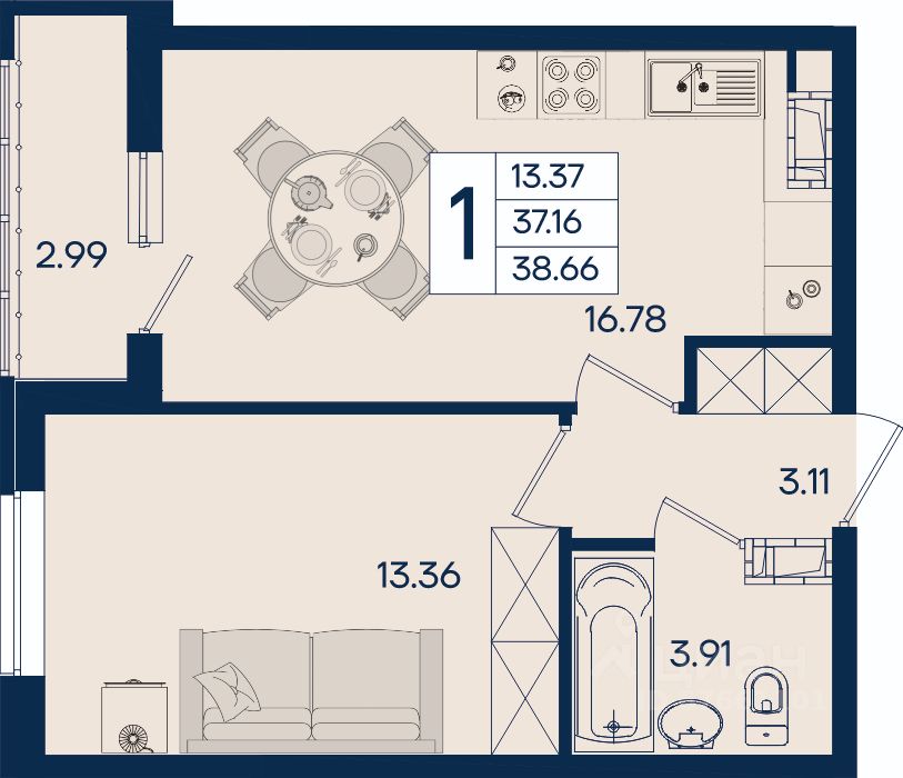 38 м² · Этаж 13 из 18