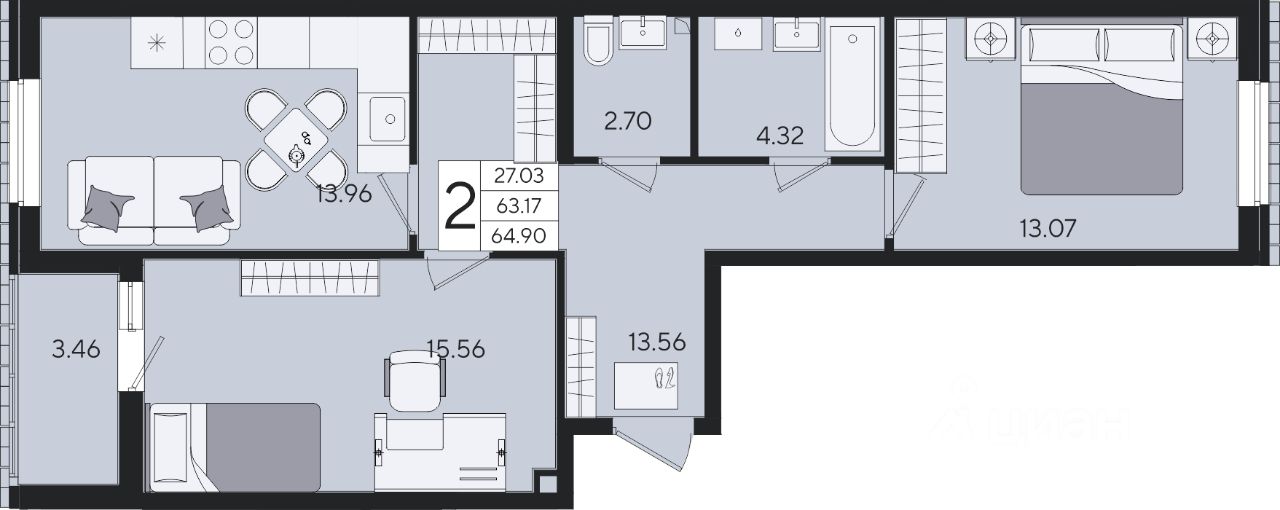 56 м² · Этаж 12 из 16