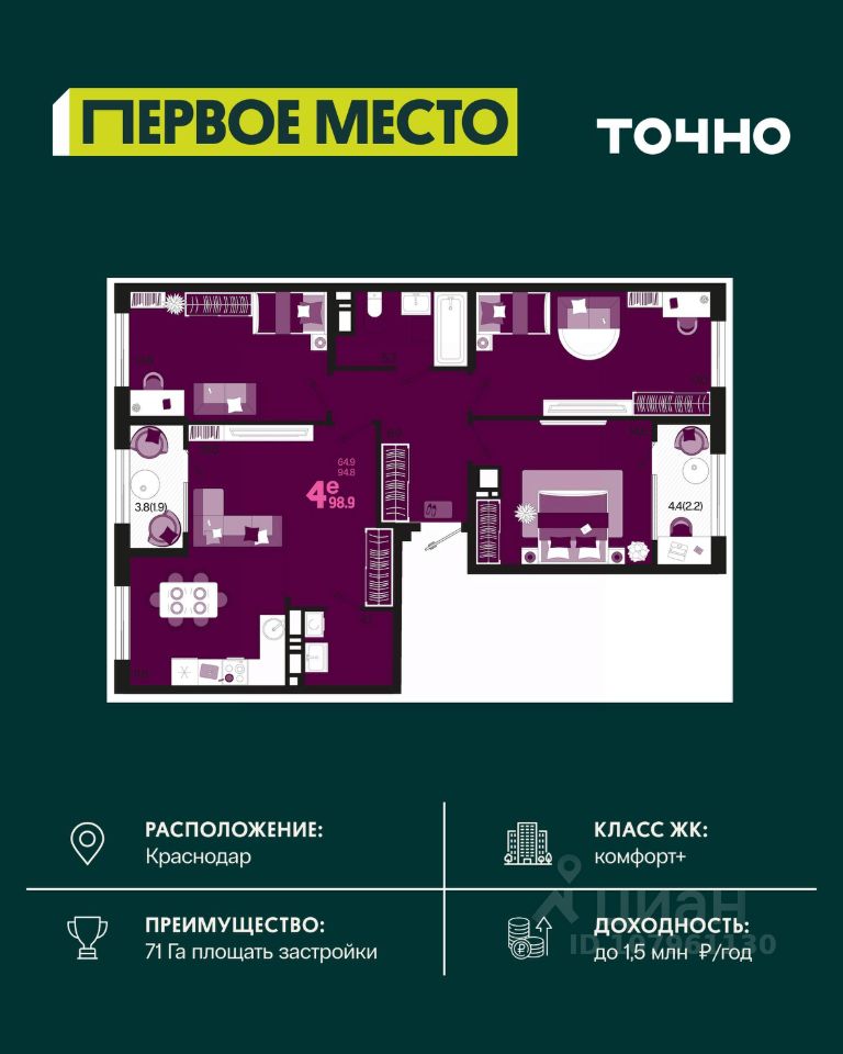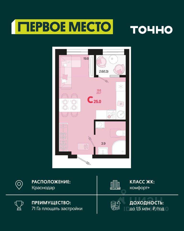 Продаётся студия в сданном доме (Дом 12 Корпус 3), срок сдачи: III-кв. 2023, общей площадью 29.4 кв.м., на 15 этаже. Микрорайон ''Красная площадь'' - новый, перспективный, масштабный, самодостаточный проект города Краснодар. Здесь создается уникальный зеленый остров, в котором парки займут 30% всей площади. Каждый житель микрорайона найдет необходимое пространство для спокойного отдыха в окружении природы. Для Вас продуманные и комфортные планировки квартир, собственный парк с авторским ландшафтом и уникальная аллея современного искусства с фонтаном, разделение зон в каждой очереди домов для отдыха и спорта, объекты социального значения - и все необходимое для уютной жизни в ритме столицы в шаговой доступности. По сути МКР ''Красная площадь'' - это микрогород с хорошо развитой инфраструктурой, который отличает удачное расположение, ощущение красоты места и гармоничность окружающего пространства. Среди ключевых преимуществ: удобное расположение поблизости от крупнейшего делового и развлекательного кластера (рядом с ВКК ''Экспоград Юг'', через дорогу от МЦ ''Красная Площадь''). Микрорайон составляют лаконичные ансамбли домов, гармонично вписанные в окружающую инфраструктуру благодаря авторской архитектуре и выразительности силуэта всей застройки. В микрорайоне несколько детских дошкольных учреждений, а в каждом дворе спортивные и детские площадки. Вы можете отдыхать всей семьей и найти развлечение на любой вкус. Всего в нескольких минутах от микрорайона находятся различные учебные заведения, а развитая транспортная сеть обеспечит быструю и комфортную поездку. Микрорайон будет радовать пенсионеров своим уникальным архитектурным дизайном, парками и скверами, где можно комфортно проводить время и заводить новых друзей! Рядом с микрорайоном располагаются современные бизнес-центры и офисы - это то, что нужно для карьерного роста молодому специалисту. Современный и уютный микрорайон не оставит равнодушными ни одного приезжего. Приемлемые цены и качество новостроек - лучший вариант приобретения нового жилья. Масштаб - комплексная застройка территории на более, чем 33 Га. Основной идеей данного проекта стало создание среды, совмещающей в себе преимущества жизни в городе (развитая инфраструктура, транспортная доступность, наличие всех необходимых коммуникаций) с прелестями загородной жизни (низкая плотность застройки, обилие зеленых насаждений, благоприятная экологическая обстановка).