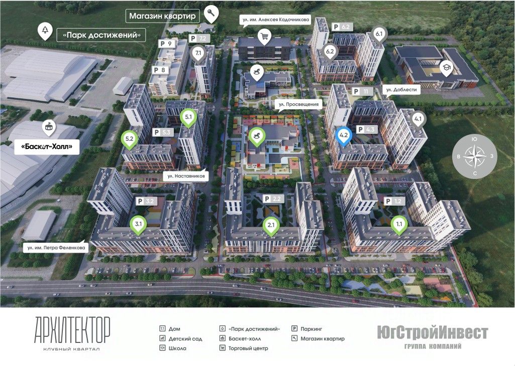 Клубный квартал ''Архитектор'' расположен в перспективном быстроразвивающемся районе города. В проекте жилого комплекса предусмотрено 10 домов разной этажности, два детских сада и школа. В каждом дворе расположена детская площадка, спроектированная совместно с психологами. Отдохнуть и провести время за разговорами с семьей и друзьями можно в различных дизайнерских лаунж-зонах. Безбарьерная среда, закрытые дворы, современное ландшафтное озеленение на территории клубного квартала способствуют комфортному пребыванию всех возрастов. В пешей доступности ''Дворец водных видов спорта'' и одна из главных спортивных арен города — ''Баскет-Холл''. Буквально 20 минут и Вы в центре города, еще 150 км — и Вас встречает побережье Краснодарского края.