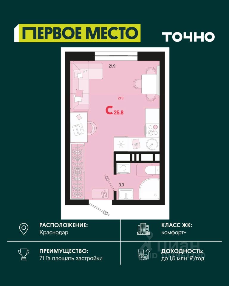 Уникальное предложение в жилом комплексе ''Репин Парк''! Комплекс расположен всего в 10 минутах от центра Краснодара, в Фестивальном микрорайоне. Строгое соблюдение сроков и высокое качество строительства - главные преимущества ''Репин Парк''. Современные технологии и материалы обеспечивают надежность и экологичность зданий. Монолитный железобетон и трехслойные наружные стены обеспечивают прочность и сохраняют тепло. Переменная этажность комплекса от 9 до 18 этажей позволяет получить больше солнечного света для всех уровней квартир с внутренней стороны. Площадь придомовой территории будет оформлена зелеными насаждениями, создавая приватное пространство для отдыха, детских игр и семейного досуга. Во дворе также будут пространства для занятий спортом и воркаутом. Парковка будет предусмотрена на подземном уровне с двухуровневым паркингом для жителей и гостевыми машиноместами. Квартира сдается с уже завершенными черновыми работами, включая коммуникации, стяжку пола, разводку электросетей и теплоснабжения, остекление окон и балконов, установку радиаторов и входных дверей. В ЖК также предусмотрены индивидуальные кладовые помещения. Благодаря удобному расположению, жители ''Репин Парк'' могут наслаждаться пешей доступностью к крупным сетевым магазинам, фитнес-клубам, школам, детским садам, кафе, ресторанам и остановкам общественного транспорта. Удобная транспортная развязка обеспечивает простой доступ и избавляет от пробок. ''Репин Парк'' предлагает комфортное расположение, полный спектр социальных и инфраструктурных объектов, современные технологии и уютную атмосферу. Качество, комфорт и доступность - вот то, что делает ''Репин Парк'' особенным. Звоните нам прямо сейчас! Успейте купить свою счастливую квартиру!