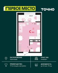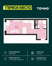 Продаётся студия в сданном доме (Дом 12 Корпус 7), срок сдачи: IV-кв. 2023, общей площадью 27.7 кв.м., на 12 этаже. Микрорайон ''Красная площадь'' - новый, перспективный, масштабный, самодостаточный проект города Краснодар. Здесь создается уникальный зеленый остров, в котором парки займут 30% всей площади. Каждый житель микрорайона найдет необходимое пространство для спокойного отдыха в окружении природы. Для Вас продуманные и комфортные планировки квартир, собственный парк с авторским ландшафтом и уникальная аллея современного искусства с фонтаном, разделение зон в каждой очереди домов для отдыха и спорта, объекты социального значения - и все необходимое для уютной жизни в ритме столицы в шаговой доступности. По сути МКР ''Красная площадь'' - это микрогород с хорошо развитой инфраструктурой, который отличает удачное расположение, ощущение красоты места и гармоничность окружающего пространства. Среди ключевых преимуществ: удобное расположение поблизости от крупнейшего делового и развлекательного кластера (рядом с ВКК ''Экспоград Юг'', через дорогу от МЦ ''Красная Площадь''). Микрорайон составляют лаконичные ансамбли домов, гармонично вписанные в окружающую инфраструктуру благодаря авторской архитектуре и выразительности силуэта всей застройки. В микрорайоне несколько детских дошкольных учреждений, а в каждом дворе спортивные и детские площадки. Вы можете отдыхать всей семьей и найти развлечение на любой вкус. Всего в нескольких минутах от микрорайона находятся различные учебные заведения, а развитая транспортная сеть обеспечит быструю и комфортную поездку. Микрорайон будет радовать пенсионеров своим уникальным архитектурным дизайном, парками и скверами, где можно комфортно проводить время и заводить новых друзей! Рядом с микрорайоном располагаются современные бизнес-центры и офисы - это то, что нужно для карьерного роста молодому специалисту. Современный и уютный микрорайон не оставит равнодушными ни одного приезжего. Приемлемые цены и качество новостроек - лучший вариант приобретения нового жилья. Масштаб - комплексная застройка территории на более, чем 33 Га. Основной идеей данного проекта стало создание среды, совмещающей в себе преимущества жизни в городе (развитая инфраструктура, транспортная доступность, наличие всех необходимых коммуникаций) с прелестями загородной жизни (низкая плотность застройки, обилие зеленых насаждений, благоприятная экологическая обстановка).