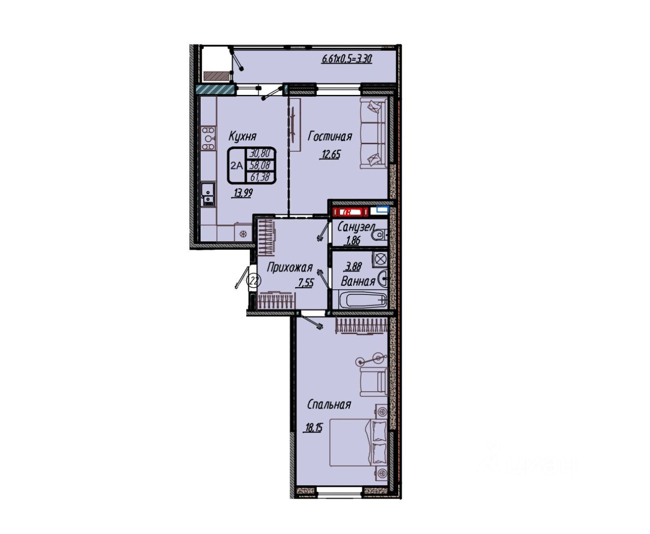 61 м² · Этаж 12 из 18