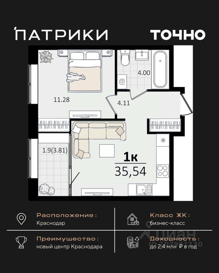 Уютная 1-комнатная квартира в ЖК ''Зеленодар'' — идеальный выбор для комфортной жизни! Продается однокомнатная квартира площадью 34,7 кв.м, расположенная на 4 этаже 16-этажного кирпичного дома комфорт-класса в жилом комплексе ''Зеленодар''. Дом уже сдан, а значит — можно заселяться сразу после сделки! Квартира находится в тихом, спокойном районе, который активно развивается. Отличная транспортная доступность, в шаговой доступности — детский сад, школа, магазины, госучреждения и остановки общественного транспорта. Преимущества квартиры: - Косметический ремонт, чисто и аккуратно - Вся необходимая мебель: диван, вместительный шкаф-купе, телевизор - Кухонный гарнитур включён - Современный санузел с кафельной плиткой - Пластиковые окна, железная входная дверь - Интернет и кабельное ТВ подключены - Чистый подъезд, вид на город - Ухоженный двор с парковкой, детской площадкой и асфальтированными дорожками Идеальный вариант как для молодой пары, так и для инвестиций — квартира полностью готова к проживанию или сдаче в аренду. Цена: 4 300 000 рублей Документы готовы, без обременений Звоните или пишите в чат, чтобы записаться на просмотр!