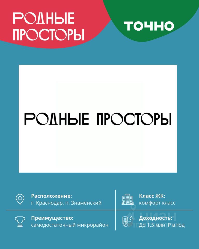 ''Родные просторы''- самодостаточный микрорайон, который реализован по принципу комплексного развития территории, где есть вся инфраструктура для комфортной жизни. На территории 41 га 29 домов от 9 до 24 этажей, уютные дворы со спортивными и игровыми площадками, социальные и коммерческие объекты, зеленые массивы и фонтаны. Главная точка притяжения ''Родных просторов'' - парк семейного отдыха площадью 9 га, 4,5 км прогулочных аллей, амфитеатр для мероприятий, кинофестивальная площадка. Особая гордость микрорайона современная школа на 1550 мест и 3 детских сада ''Ладушки'', ''Веснушки'' и ''Топотушки'' на 880 малышей. В центре микрорайона строятся фитнес-клуб BALANCE с акватермальным комплексом и собственная поликлиника, площадью более 5000 кв.м. Уже открыт православный храм Святых Первоверховных апостолов Петра и Павла.