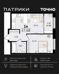 Продаётся 1-комнатная квартира в сданном доме (Дом 12 Корпус 4), срок сдачи: III-кв. 2023, общей площадью 40.1 кв.м., на 12 этаже. Микрорайон ''Красная площадь'' - новый, перспективный, масштабный, самодостаточный проект города Краснодар. Здесь создается уникальный зеленый остров, в котором парки займут 30% всей площади. Каждый житель микрорайона найдет необходимое пространство для спокойного отдыха в окружении природы. Для Вас продуманные и комфортные планировки квартир, собственный парк с авторским ландшафтом и уникальная аллея современного искусства с фонтаном, разделение зон в каждой очереди домов для отдыха и спорта, объекты социального значения - и все необходимое для уютной жизни в ритме столицы в шаговой доступности. По сути МКР ''Красная площадь'' - это микрогород с хорошо развитой инфраструктурой, который отличает удачное расположение, ощущение красоты места и гармоничность окружающего пространства. Среди ключевых преимуществ: удобное расположение поблизости от крупнейшего делового и развлекательного кластера (рядом с ВКК ''Экспоград Юг'', через дорогу от МЦ ''Красная Площадь''). Микрорайон составляют лаконичные ансамбли домов, гармонично вписанные в окружающую инфраструктуру благодаря авторской архитектуре и выразительности силуэта всей застройки. В микрорайоне несколько детских дошкольных учреждений, а в каждом дворе спортивные и детские площадки. Вы можете отдыхать всей семьей и найти развлечение на любой вкус. Всего в нескольких минутах от микрорайона находятся различные учебные заведения, а развитая транспортная сеть обеспечит быструю и комфортную поездку. Микрорайон будет радовать пенсионеров своим уникальным архитектурным дизайном, парками и скверами, где можно комфортно проводить время и заводить новых друзей! Рядом с микрорайоном располагаются современные бизнес-центры и офисы - это то, что нужно для карьерного роста молодому специалисту. Современный и уютный микрорайон не оставит равнодушными ни одного приезжего. Приемлемые цены и качество новостроек - лучший вариант приобретения нового жилья. Масштаб - комплексная застройка территории на более, чем 33 Га. Основной идеей данного проекта стало создание среды, совмещающей в себе преимущества жизни в городе (развитая инфраструктура, транспортная доступность, наличие всех необходимых коммуникаций) с прелестями загородной жизни (низкая плотность застройки, обилие зеленых насаждений, благоприятная экологическая обстановка).