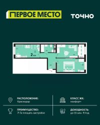 Продаётся 2-комнатная квартира в сданном доме (Дом 12 Корпус 4), срок сдачи: III-кв. 2023, общей площадью 59.7 кв.м., на 12 этаже. Микрорайон ''Красная площадь'' - новый, перспективный, масштабный, самодостаточный проект города Краснодар. Здесь создается уникальный зеленый остров, в котором парки займут 30% всей площади. Каждый житель микрорайона найдет необходимое пространство для спокойного отдыха в окружении природы. Для Вас продуманные и комфортные планировки квартир, собственный парк с авторским ландшафтом и уникальная аллея современного искусства с фонтаном, разделение зон в каждой очереди домов для отдыха и спорта, объекты социального значения - и все необходимое для уютной жизни в ритме столицы в шаговой доступности. По сути МКР ''Красная площадь'' - это микрогород с хорошо развитой инфраструктурой, который отличает удачное расположение, ощущение красоты места и гармоничность окружающего пространства. Среди ключевых преимуществ: удобное расположение поблизости от крупнейшего делового и развлекательного кластера (рядом с ВКК ''Экспоград Юг'', через дорогу от МЦ ''Красная Площадь''). Микрорайон составляют лаконичные ансамбли домов, гармонично вписанные в окружающую инфраструктуру благодаря авторской архитектуре и выразительности силуэта всей застройки. В микрорайоне несколько детских дошкольных учреждений, а в каждом дворе спортивные и детские площадки. Вы можете отдыхать всей семьей и найти развлечение на любой вкус. Всего в нескольких минутах от микрорайона находятся различные учебные заведения, а развитая транспортная сеть обеспечит быструю и комфортную поездку. Микрорайон будет радовать пенсионеров своим уникальным архитектурным дизайном, парками и скверами, где можно комфортно проводить время и заводить новых друзей! Рядом с микрорайоном располагаются современные бизнес-центры и офисы - это то, что нужно для карьерного роста молодому специалисту. Современный и уютный микрорайон не оставит равнодушными ни одного приезжего. Приемлемые цены и качество новостроек - лучший вариант приобретения нового жилья. Масштаб - комплексная застройка территории на более, чем 33 Га. Основной идеей данного проекта стало создание среды, совмещающей в себе преимущества жизни в городе (развитая инфраструктура, транспортная доступность, наличие всех необходимых коммуникаций) с прелестями загородной жизни (низкая плотность застройки, обилие зеленых насаждений, благоприятная экологическая обстановка).