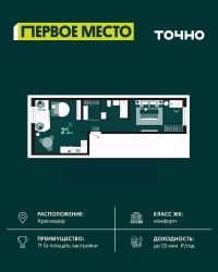 Продается студия площадью 30.07 кв. м. на 16 этаже 18 этажного дома, 1 подъезд, номер 177. Стоимость данного лота включает в себя ремонт, мебель и технику. Будут представлены 3 варианта обустройства квартиры: светлый, тонированный и авторский. Для более подробного ознакомления вы можете обратиться в отдел продаж. Жилой комплекс ''ИНАЧЕ в Молодежном'' включает в себя 14 домов комфорт+ класса переменной этажности с более чем 100 видами планировок, в том числе квартиры с террасами, двухуровневые квартиры и урбан виллы, детский сад на 350 мест, храм, 2 наземных паркинга, а также бульвар и прогулочные аллеи. Срок сдачи первой очереди 4 квартал 2026 года Жилой комплекс находится в Молодежном — тихом микрорайоне с атмосферой размеренной жизни. Рядом расположен зеленый сквер ''Изумрудный'' с зелеными деревьями и велодорожками. Молодежный — молодой район с готовой инфраструктурой. Всю бытовую и семейную можно легко организовать на расстоянии 10 минут от дома. Есть новая школа, два детских сада, поликлиника, работают магазины, аптеки и салоны красоты. Жилой комплекс расположен рядом с удобными выездами на ключевые городские дороги. Можно быстро доехать как в центр города, так и до моря по Ейскому шоссе. Главные чувства от прогулки по нашему району простота и легкость. Архитектуру мы проработали совместно с архитектурным бюро Маликова и создали район с современным лаконичным обликом. При этом мы учли сценарии жизни людей и современные тренды. В наших домах будут разноэтажные секции. Французские балконы и увеличенные окна. На фасадах не будет визуального шума: кондиционеры будут скрыты с специальных корзинах. По всей территории продумана безбарьерная сеть тротуаров и переходов. Любое перемещение — пешком или с коляской — станет комфортным. - На территории комплекса будут расположены детские и спортивные площадки, а также амфитеатр, арт-объект и храм. - 40% территории занимает озеленение с более чем 50 видами растений. - Хранить автомобиль с комфортом и беречь его от осадков помогут два наземных многоуровневых паркинга. Кроме крытых паркингов, на территории есть открытые — в достаточном числе для жителей и гостей района. - Проект включает в себя строительство современного детского сада и так же в пешей доступности находятся 2 школы. - На первых этажах мы создадим коммерческие помещения с планировками, которые помогают бизнесу. Умный проект коммерции включает удобные входные группы, высокие потолки и панорамные окна, приглашающие заглянуть внутрь. - Эстетика холла продолжает природную идею района. Дизайнерские холлы выполненные в натуральных цветах с живыми деревьями включают в себя места для ожидания, встреч, санузлы, колясочные и постаматы. - Система аудиомультирум в каждой квартир - распределение аудио- и видео-сигналов по всей квартире. Для более подробного ознакомления вы можете обратиться в отдел продаж.