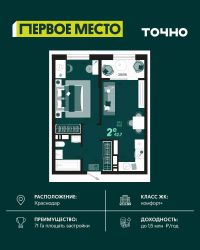 Продаётся 1-комнатная квартира в сданном доме (Дом 12), срок сдачи: II-кв. 2023, общей площадью 41.4 кв.м., на 13 этаже. Микрорайон ''Красная площадь'' - новый, перспективный, масштабный, самодостаточный проект города Краснодар. Здесь создается уникальный зеленый остров, в котором парки займут 30% всей площади. Каждый житель микрорайона найдет необходимое пространство для спокойного отдыха в окружении природы. Для Вас продуманные и комфортные планировки квартир, собственный парк с авторским ландшафтом и уникальная аллея современного искусства с фонтаном, разделение зон в каждой очереди домов для отдыха и спорта, объекты социального значения - и все необходимое для уютной жизни в ритме столицы в шаговой доступности. По сути МКР ''Красная площадь'' - это микрогород с хорошо развитой инфраструктурой, который отличает удачное расположение, ощущение красоты места и гармоничность окружающего пространства. Среди ключевых преимуществ: удобное расположение поблизости от крупнейшего делового и развлекательного кластера (рядом с ВКК ''Экспоград Юг'', через дорогу от МЦ ''Красная Площадь''). Микрорайон составляют лаконичные ансамбли домов, гармонично вписанные в окружающую инфраструктуру благодаря авторской архитектуре и выразительности силуэта всей застройки. В микрорайоне несколько детских дошкольных учреждений, а в каждом дворе спортивные и детские площадки. Вы можете отдыхать всей семьей и найти развлечение на любой вкус. Всего в нескольких минутах от микрорайона находятся различные учебные заведения, а развитая транспортная сеть обеспечит быструю и комфортную поездку. Микрорайон будет радовать пенсионеров своим уникальным архитектурным дизайном, парками и скверами, где можно комфортно проводить время и заводить новых друзей! Рядом с микрорайоном располагаются современные бизнес-центры и офисы - это то, что нужно для карьерного роста молодому специалисту. Современный и уютный микрорайон не оставит равнодушными ни одного приезжего. Приемлемые цены и качество новостроек - лучший вариант приобретения нового жилья. Масштаб - комплексная застройка территории на более, чем 33 Га. Основной идеей данного проекта стало создание среды, совмещающей в себе преимущества жизни в городе (развитая инфраструктура, транспортная доступность, наличие всех необходимых коммуникаций) с прелестями загородной жизни (низкая плотность застройки, обилие зеленых насаждений, благоприятная экологическая обстановка).