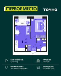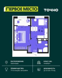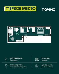 Продается 1 комнатная квартира площадью 35.72 кв. м. на 18 этаже 18 этажного дома, 1 подъезд, номер 197. Стоимость данного лота включает в себя ремонт, мебель и технику. Будут представлены 3 варианта обустройства квартиры: светлый, тонированный и авторский. Для более подробного ознакомления вы можете обратиться в отдел продаж. Жилой комплекс ''ИНАЧЕ в Молодежном'' включает в себя 14 домов комфорт+ класса переменной этажности с более чем 100 видами планировок, в том числе квартиры с террасами, двухуровневые квартиры и урбан виллы, детский сад на 350 мест, храм, 2 наземных паркинга, а также бульвар и прогулочные аллеи. Срок сдачи первой очереди 4 квартал 2026 года Жилой комплекс находится в Молодежном — тихом микрорайоне с атмосферой размеренной жизни. Рядом расположен зеленый сквер ''Изумрудный'' с зелеными деревьями и велодорожками. Молодежный — молодой район с готовой инфраструктурой. Всю бытовую и семейную можно легко организовать на расстоянии 10 минут от дома. Есть новая школа, два детских сада, поликлиника, работают магазины, аптеки и салоны красоты. Жилой комплекс расположен рядом с удобными выездами на ключевые городские дороги. Можно быстро доехать как в центр города, так и до моря по Ейскому шоссе. Главные чувства от прогулки по нашему району простота и легкость. Архитектуру мы проработали совместно с архитектурным бюро Маликова и создали район с современным лаконичным обликом. При этом мы учли сценарии жизни людей и современные тренды. В наших домах будут разноэтажные секции. Французские балконы и увеличенные окна. На фасадах не будет визуального шума: кондиционеры будут скрыты с специальных корзинах. По всей территории продумана безбарьерная сеть тротуаров и переходов. Любое перемещение — пешком или с коляской — станет комфортным. - На территории комплекса будут расположены детские и спортивные площадки, а также амфитеатр, арт-объект и храм. - 40% территории занимает озеленение с более чем 50 видами растений. - Хранить автомобиль с комфортом и беречь его от осадков помогут два наземных многоуровневых паркинга. Кроме крытых паркингов, на территории есть открытые — в достаточном числе для жителей и гостей района. - Проект включает в себя строительство современного детского сада и так же в пешей доступности находятся 2 школы. - На первых этажах мы создадим коммерческие помещения с планировками, которые помогают бизнесу. Умный проект коммерции включает удобные входные группы, высокие потолки и панорамные окна, приглашающие заглянуть внутрь. - Эстетика холла продолжает природную идею района. Дизайнерские холлы выполненные в натуральных цветах с живыми деревьями включают в себя места для ожидания, встреч, санузлы, колясочные и постаматы. - Система аудиомультирум в каждой квартир - распределение аудио- и видео-сигналов по всей квартире. Для более подробного ознакомления вы можете обратиться в отдел продаж.