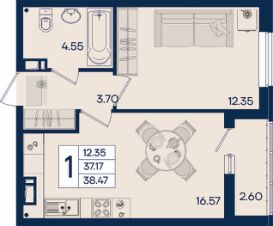 1 комнатная квартира 38.47 м² с ремонтом, на 7 этаже в жилом комплексе ''Дом 101''. ЖК Дом 101 - это уникальное пространство на территории 101 га. Парк 20 га с спортивными площадками и амфитеатром. Школа на 1725 мест и пять детских садов. Благоустроенные дворовые территории с детскими площадками и зонами отдыха создают комфортную среду для семей. 860