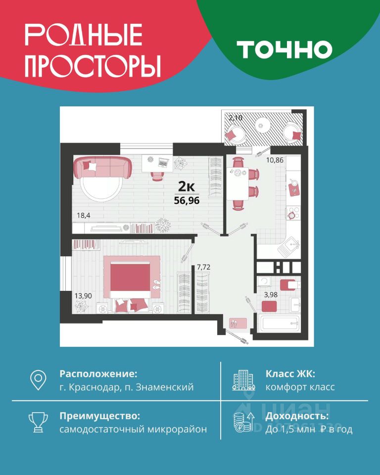 Микрорайон ''Тёплые края'' — это масштабный проект комплексного освоения территории. Жилой комплекс воплотил в себе все самые высокие критерии отбора квартиры по планировочным решениям, благоустройству и инфраструктуре. Преимущества, которые действительно важны: Комфорт и качество: • Монолитно-кирпичные дома с шумо- и теплоизоляцией. • Высокие потолки до 4,2 м, панорамные окна, функциональные планировки. • Предчистовая или чистовая отделка — можно сразу заехать или реализовать свой дизайн. Безопасные дворы без машин, видеонаблюдение, закрытая территория. Благоустройство: • Более 65 000 м² зелёных зон, скверы, аллеи, прогулочные бульвары. • 40 000 м² детских и спортивных площадок — от workout-зон до игровых городков. • Зоны отдыха и барбекю — идеальны для встреч с друзьями и семейных вечеров. Всё рядом: • Собственная школа на 1 800 мест и 3 детских сада на 950 мест. • Поликлиника, аптеки, магазины, кафе и пекарни в шаговой доступности. • Свой торгово-развлекательный центр, фитнес-клуб, фермерский рынок. Удобное расположение: • Район с чистым воздухом, рядом природа и река Кубань. • 15 минут до центра Краснодара и выезда на трассу в сторону моря. • Развитое транспортное сообщение — маршрутки, автобусы, удобные дороги. Выгодные условия покупки: • Семейная ипотека от 2,5%. • IT ипотека - 6%. • Возможность покупки по господдержке и с использованием маткапитала. • Рассрочка с удобным графиком платежей. • Высокий потенциал роста стоимости жилья. Почему ''Тёплые края'' — лучший выбор: • Район строится по принципу ''город в городе'': всё для жизни внутри. • Комфортный баланс между городским ритмом и уютом пригорода. • Идеально подходит и для жизни, и для инвестиций. СК Семья входит в топ-5 среди застройщиков Краснодарского края. Надёжная компания с десятками реализованных проектов. Звоните — поможем Вам сделать правильный выбор и подобрать лучший вариант под ваш бюджет и цели.