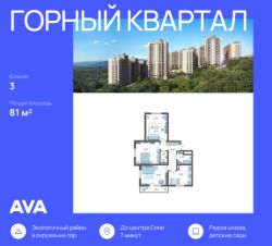 Продается 3-комнатная квартира в доме (Литер 4), срок сдачи : 3 кв. 2026, общей площадью 81.1 кв.м., на 6 этаже в новом современном жилом комплексе в Сочи ''Горный квартал'', Хостинский район. Отличный вариант для инвестиций и жизни. Жилой квартал из шести 16-этажных домов находится на горном склоне. Дома расположены таким образом, что из окон каждой квартиры на верхних этажах открывается прекрасная горная панорама. ''Горный квартал'' отличают великолепные закрытые дворы с современными детскими и спортивными площадками, беседками с навесами и гамаками, площадкой для йоги и кинотеатр под открытым небом. Вниз на лифте можно спуститься к магазинам, что займут первые этажи, поблизости находятся школы, детские сады, поликлиника и автобусные остановки. Приятный бонус к благам цивилизации - идеальная экология, великолепное звездное небо, которое видно только в горах, самый настоящий лес и чистые озёра рядом с домом. Расположение на возвышенности позволяет избежать подтоплений. Территория безопасна и защищена от неблагоприятных природных явлений. Удобная транспортная развязка позволяет быстро добраться в любую точку Сочи и Адлера. До моря всего 15 минут на автомобиле! Условия строительства и покупки Дома строятся по 214 ФЗ с использованием эскроу-счетовСпособы оплаты: рассрочка, ипотека, материнский капиталОтдел продаж застройщикаОтличный вариант для жизни и инвестиций! Звоните! Рады ответить на все вопросы! Квартира 35.