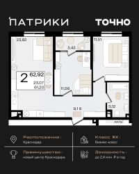 Продается 2 комнатная квартира площадью 59.72 кв. м. на 3 этаже 18 этажного дома, 1 подъезд, номер 23. Стоимость данного лота включает в себя ремонт, мебель и технику. Будут представлены 3 варианта обустройства квартиры: светлый, тонированный и авторский. Для более подробного ознакомления вы можете обратиться в отдел продаж. Жилой комплекс ''ИНАЧЕ в Молодежном'' включает в себя 14 домов комфорт+ класса переменной этажности с более чем 100 видами планировок, в том числе квартиры с террасами, двухуровневые квартиры и урбан виллы, детский сад на 350 мест, храм, 2 наземных паркинга, а также бульвар и прогулочные аллеи. Срок сдачи первой очереди 4 квартал 2026 года Жилой комплекс находится в Молодежном — тихом микрорайоне с атмосферой размеренной жизни. Рядом расположен зеленый сквер ''Изумрудный'' с зелеными деревьями и велодорожками. Молодежный — молодой район с готовой инфраструктурой. Всю бытовую и семейную можно легко организовать на расстоянии 10 минут от дома. Есть новая школа, два детских сада, поликлиника, работают магазины, аптеки и салоны красоты. Жилой комплекс расположен рядом с удобными выездами на ключевые городские дороги. Можно быстро доехать как в центр города, так и до моря по Ейскому шоссе. Главные чувства от прогулки по нашему району простота и легкость. Архитектуру мы проработали совместно с архитектурным бюро Маликова и создали район с современным лаконичным обликом. При этом мы учли сценарии жизни людей и современные тренды. В наших домах будут разноэтажные секции. Французские балконы и увеличенные окна. На фасадах не будет визуального шума: кондиционеры будут скрыты с специальных корзинах. По всей территории продумана безбарьерная сеть тротуаров и переходов. Любое перемещение — пешком или с коляской — станет комфортным. - На территории комплекса будут расположены детские и спортивные площадки, а также амфитеатр, арт-объект и храм. - 40% территории занимает озеленение с более чем 50 видами растений. - Хранить автомобиль с комфортом и беречь его от осадков помогут два наземных многоуровневых паркинга. Кроме крытых паркингов, на территории есть открытые — в достаточном числе для жителей и гостей района. - Проект включает в себя строительство современного детского сада и так же в пешей доступности находятся 2 школы. - На первых этажах мы создадим коммерческие помещения с планировками, которые помогают бизнесу. Умный проект коммерции включает удобные входные группы, высокие потолки и панорамные окна, приглашающие заглянуть внутрь. - Эстетика холла продолжает природную идею района. Дизайнерские холлы выполненные в натуральных цветах с живыми деревьями включают в себя места для ожидания, встреч, санузлы, колясочные и постаматы. - Система аудиомультирум в каждой квартир - распределение аудио- и видео-сигналов по всей квартире. Для более подробного ознакомления вы можете обратиться в отдел продаж.