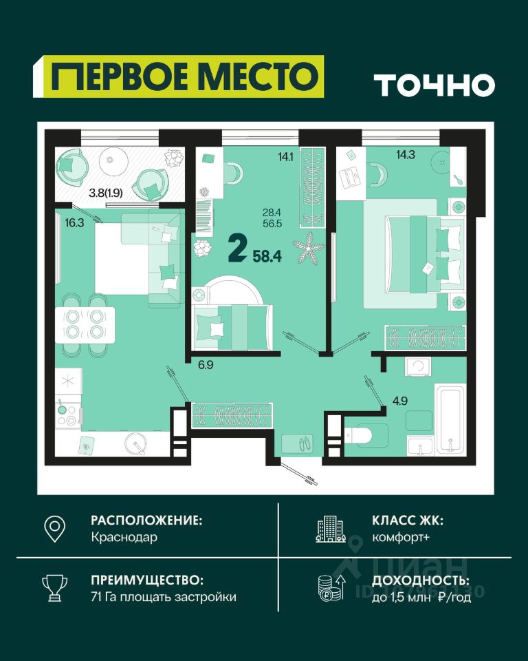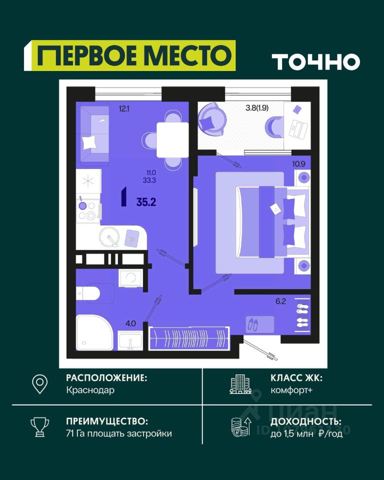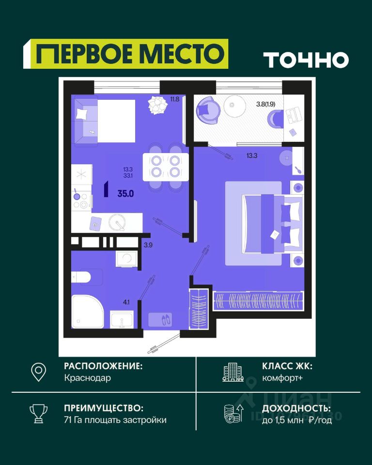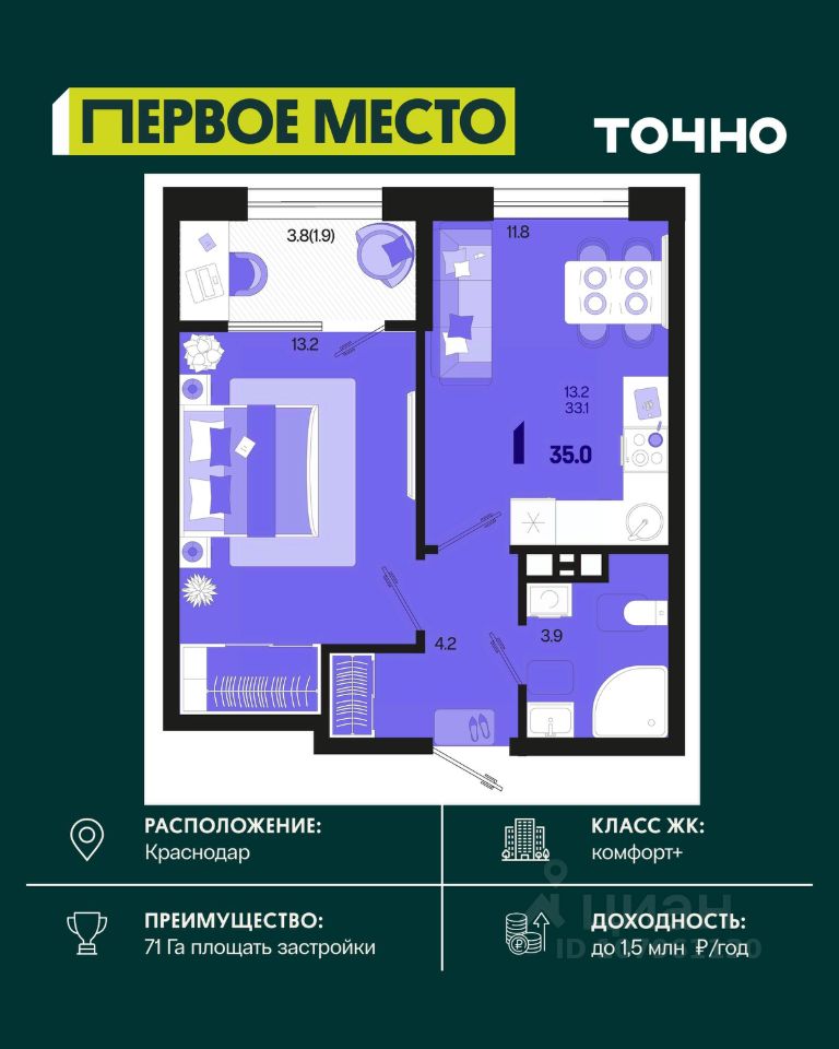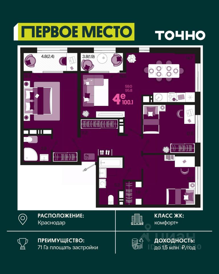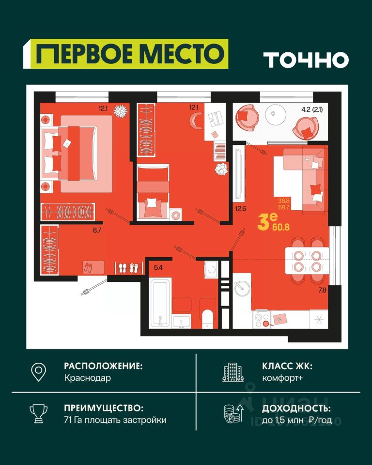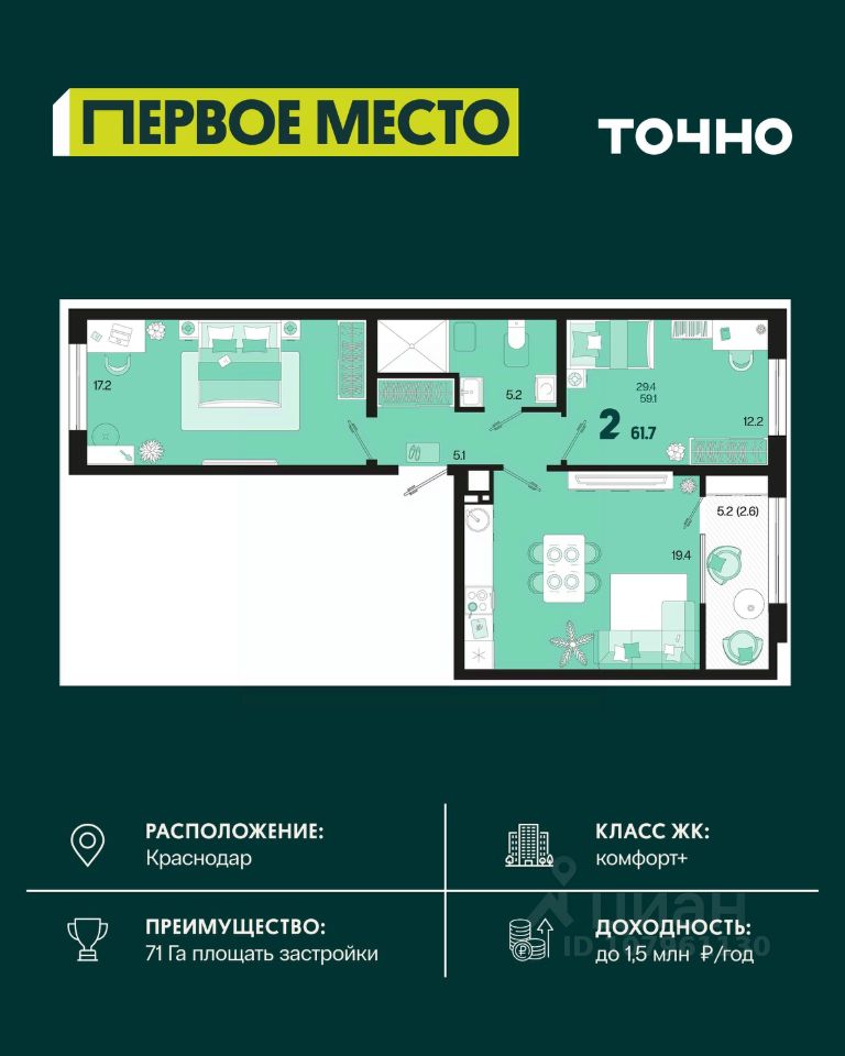 ЖК ''Югге'': южнее только море, уютнее только дома. Представьте себе: вы просыпаетесь утром, выходите на просторную лоджию и встречаете новый день с видом на зелёный парк, наполненный ароматом хвои. Вокруг - тишина, спокойствие и ощущение полной гармонии с природой. Это не мечта, это реальность в ЖК ''Югге''! Экологически чистый район Краснодара ЖК ''Югге'' расположен в экологически чистом районе, всего в 15 минутах от центра Краснодара. Здесь есть всё необходимое для комфортной жизни: школы и детские сады, медицинские учреждения, торговые центры и магазины. Удобная транспортная доступность. Свежий воздух и природа окружают вас со всех сторон. Собственная территория комплекса засажена хвойными деревьями, что создает уютный зелёный оазис в черте города. Панорамные окна и просторные квартиры Панорамные окна и большие лоджии с видом на внутренний парк наполняют квартиры светом и создают ощущение простора. Высокие потолки и просторные комнаты обеспечивают максимальный комфорт для жизни. Выбирайте из разнообразных планировок - от уютных студий до просторных трёхкомнатных квартир. Цены и условия покупки: Рассрочка от застройщика без процентов - гибкие условия оплаты. Ипотечные программы с субсидиями - доступные кредиты с поддержкой государства. У нас одобряют 95% ипотечных заявок. Материнский капитал - возможность использовать его для покупки жилья. Скидка 3% при 100% оплате - экономия при полной оплате. Скидка 1% при бронировании в день показа - не упустите шанс получить дополнительную выгоду. Скидка, которая греет до 9% (Базовая до 5% и суммируется со скидками 1 и 3 %). Подарочный сертификат на кухню или мебель - приятный бонус для новых жильцов. Безопасная сделка с эскроу-счетом. Покупка жилья в ''Югге'' безопасна и надёжна благодаря проектному финансированию Сбербанка. Ваши средства защищены, а качество строительства гарантировано. Заинтересовались ЖК ''Югге''? Звоните: мы подробно расскажем о преимуществах комплекса, проконсультируем по условиям покупки и отправим вам всю необходимую информацию для принятия решения! Идеально расположен, идеально обустроен, идеально для переезда!