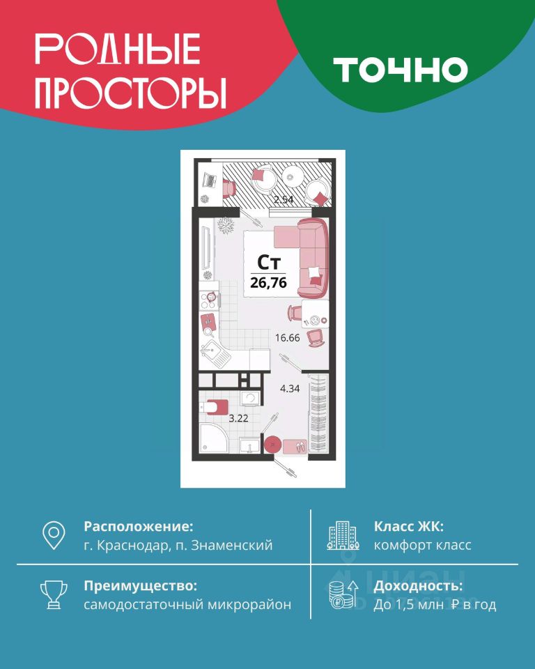 Покупайте выгодно в Краснодаре — самые доступные квартиры в ЖК ''Огурцы''! Успейте купить квартиру по специальным условиям в популярном районе Краснодара. Жилой комплекс: Жилой комплекс ''Огурцы'' представляет собой два современных дома комфорт-класса высотой 22 и 24 этажа, выполненных по монолитно-кирпичной технологии. Характерной особенностью являются окна с элегантной зеленоватой тонировкой, защищающей от солнечных лучей и придающей зданию особый шарм. Во дворе обустроены детская игровая площадка с безопасным покрытием, спортивная зона с баскетбольным кортом и благоустроенные места для приятного отдыха. Дизайн фасадов выполнен в оригинальном стиле, гармонично сочетающемся с окружающей средой. Квартиры: Квартиры в ЖК ''Огурцы'' спроектированы с учётом принципов эргономики и функциональности. Большие комнаты, высокие потолки и панорамные окна обеспечивают отличное освещение и живописный вид. Просторные лоджии позволяют обустроить зону отдыха или рабочее пространство. Дополнительно предусмотрена коммерческая инфраструктура на нижних этажах, включающая торговые площади и предприятия сферы услуг. Расположение: Микрорайон Молодёжный в Краснодаре — это ''город в городе'' с развитой инфраструктурой. ЖК ''Огурцы'' расположен рядом с новым ультрасовременным сквером ''Изумрудный'' и парком ''Ореховая роща''. В шаговой доступности находятся школы, детские сады, медицинские учреждения, фитнес-клубы, супермаркеты, салоны красоты, отделения банков, кафе и рестораны. В 10 минутах езды — спортивный центр ''Баскетхолл'', СК ''ЦСКА'', Дворец Самбо и торговый центр ''Красная площадь''. До центра Краснодара 20 минут. Рядом с домом находится остановка общественного транспорта, позволяющая легко добраться в любую точку города. Доступные цены и выгодные условия покупки: Жилой комплекс ''Огурцы'' предлагает доступные цены на жилую и коммерческую недвижимость с возможностью использования государственных субсидий и кредитных программ, включая семейную ипотеку по сниженной процентной ставке. Это делает покупку квартиры выгодной инвестицией. - Скидка 3% при 100% оплате наличными. - Скидка 1% при бронировании в день показа. - Купи в рассрочку от застройщика — зафиксируй цену! - Скидка которая греет до 9% (Базовая до 5% и суммируется со скидками 1 и 3 %). - Акция для участников СВО и их родственников. - Приведи друга — получи деньги! - Подарочный сертификат на кухню или мебель в подарок. Наш проект предназначен для удовлетворения широкого круга требований покупателей, стремящихся к качеству жизни и хорошей экологии. Здесь созданы оптимальные условия для семейной жизни, активного досуга и качественного проживания. Сделайте правильный выбор, инвестируя в лучшее качество жизни. Наслаждайтесь комфортом современного жилья с удобствами, бережно сохраняя семейный бюджет и получая удовольствие от каждого дня в прекрасном районе! Позвоните или оставьте заявку, чтобы узнать больше и увидеть всё своими глазами! Ваш новый дом ждёт вас!