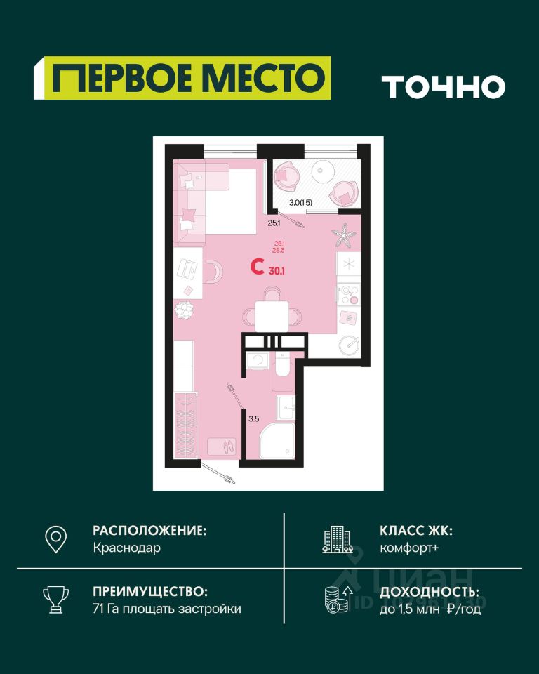 Продаётся 1-комнатная квартира в сданном доме (Литер 2.8), срок сдачи: IV-кв. 2024, общей площадью 29.1 кв.м., на 5 этаже. Расположение, транспортная доступность Жилой квартал ''Спортивная деревня'' занимает территорию 23 га у шоссе Западный Обход. Это экологически чистый и молодой район на северо-западе Краснодара, окруженный дачными поселками и сельскохозяйственными полями и расположенный в 12 км от центра города. Здесь ведется жилищное строительство, развивается социальная, коммерческая и транспортная инфраструктура. Около комплекса расположена остановка автобусов и маршрутных такси с новым названием ''Спортивная деревня'', запланирована прокладка троллейбусной линии. Инфраструктура На первых этажах домов открываются магазины, службы быта, отделения банков, салоны красоты, офисы компаний, сферы услуг и т.д. Внутри комплекса строятся детский сад и общеобразовательная школа. До открытия собственного учебного заведения организован школьный автобус, который отвозит детей к школе 68. В получасе езды на автомобиле расположены Ледовый дворец, спорткомплексы ''Баскет-Холл'' и ''Город спорта'', Центр водных видов спорта. Рядом с домом находятся остановки автобусов и маршрутных такси, на которых можно доехать: до гипермаркета ''О'кей'', мега-центра ''Красная площадь'', ТРК ''МЕГА Адыгея-Кубань'', ТРЦ ''Галерея'', супермаркетов ''Магнит'' и ''Табрис'', Кубанского аграрного университета, детской школы искусств, Краснодарского цирка и многих других объектов инфраструктуры. Надежность застройщика Проект комплексной застройки ''Спортивная деревня'' реализует корпорация ''Девелопмент-Юг'', которая была основана в 1995 году и входит в тройку крупнейших застройщиков южного региона России. Приступив к работе над проектом, компания имела значительный опыт в сфере жилищного строительства: на ее счету было около 100 введенных в эксплуатацию домов в десятках комплексов, среди которых ''Тургеневский двор'', ''Три богатыря'', ''Фестивальный'', ''Новый город'', ''Симфония'', ''Триумф'', ''Прогресс'' и другие. С 2013 года корпорация специализируется на комплексном освоении территорий, создавая жилые микрорайоны с инфраструктурой. Первыми объектами нового направления стали ЖК ''Прогресс'' и ''Спортивная деревня'' (работа начата в 2014 году). Приоритетная технология - монолитно-каркасное домостроение, классы жилья - ''эконом'', ''комфорт'' и ''бизнес''. Среди объектов премиального уровня - ЖК ''Ривьера''. На жилые дома застройщик дает пятилетнюю гарантию, построенные дома обслуживает его собственная управляющая компания. Строительство ведется в соответствии с требованиями закона 214-ФЗ. Покупателям предложен весь набор опций по условиям оплаты: ипотека, материнский капитал, рассрочка, бесплатные консультации, оформление и страхование сделки. Архитектура На территории 23 гектара строится жилой микрорайон из 19 монолитно-кирпичных домов высотой от 9 до 12 этажей. Всего в ''Спортивной Деревне'' запланировано 4350 квартир площадью от 22 до 71 кв. м. Планировки разные: есть традиционные квартиры (однокомнатные 30