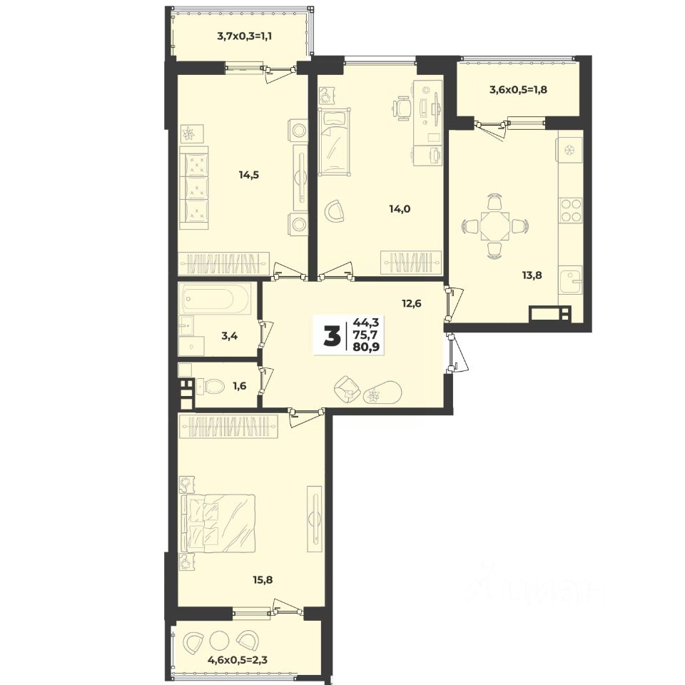 Продаётся 3-комнатная квартира в сданном доме (Литер 1.3), срок сдачи: IV-кв. 2024, общей площадью 80.9 кв.м., на 2 этаже. Новый жилой комплекс ''Лето'' от застройщика ''ГК Дарстрой'' расположен по адресу город Краснодар, улица Западный Обход.