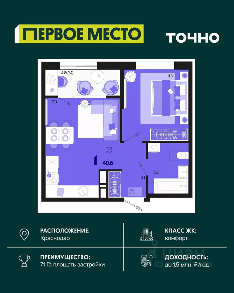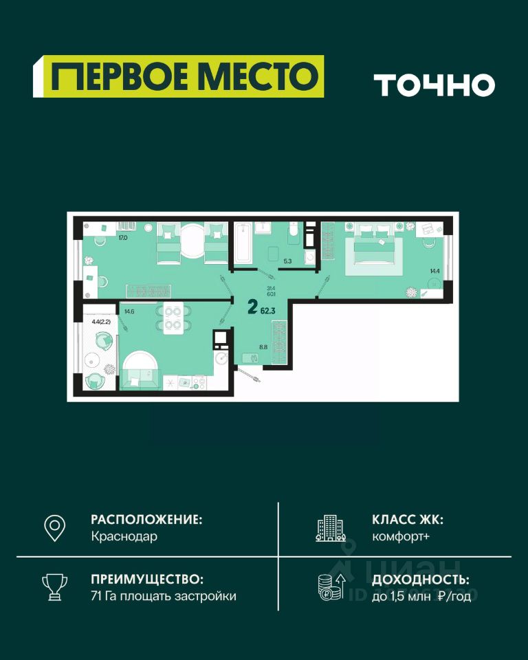 Уникальное предложение в жилом комплексе ''Репин Парк''! Комплекс расположен всего в 10 минутах от центра Краснодара, в Фестивальном микрорайоне. Строгое соблюдение сроков и высокое качество строительства - главные преимущества ''Репин Парк''. Современные технологии и материалы обеспечивают надежность и экологичность зданий. Монолитный железобетон и трехслойные наружные стены обеспечивают прочность и сохраняют тепло. Переменная этажность комплекса от 9 до 18 этажей позволяет получить больше солнечного света для всех уровней квартир с внутренней стороны. Площадь придомовой территории будет оформлена зелеными насаждениями, создавая приватное пространство для отдыха, детских игр и семейного досуга. Во дворе также будут пространства для занятий спортом и воркаутом. Парковка будет предусмотрена на подземном уровне с двухуровневым паркингом для жителей и гостевыми машиноместами. Квартира сдается с уже завершенными черновыми работами, включая коммуникации, стяжку пола, разводку электросетей и теплоснабжения, остекление окон и балконов, установку радиаторов и входных дверей. В ЖК также предусмотрены индивидуальные кладовые помещения. Благодаря удобному расположению, жители ''Репин Парк'' могут наслаждаться пешей доступностью к крупным сетевым магазинам, фитнес-клубам, школам, детским садам, кафе, ресторанам и остановкам общественного транспорта. Удобная транспортная развязка обеспечивает простой доступ и избавляет от пробок. ''Репин Парк'' предлагает комфортное расположение, полный спектр социальных и инфраструктурных объектов, современные технологии и уютную атмосферу. Качество, комфорт и доступность - вот то, что делает ''Репин Парк'' особенным. Звоните нам прямо сейчас! Успейте купить свою счастливую квартиру!