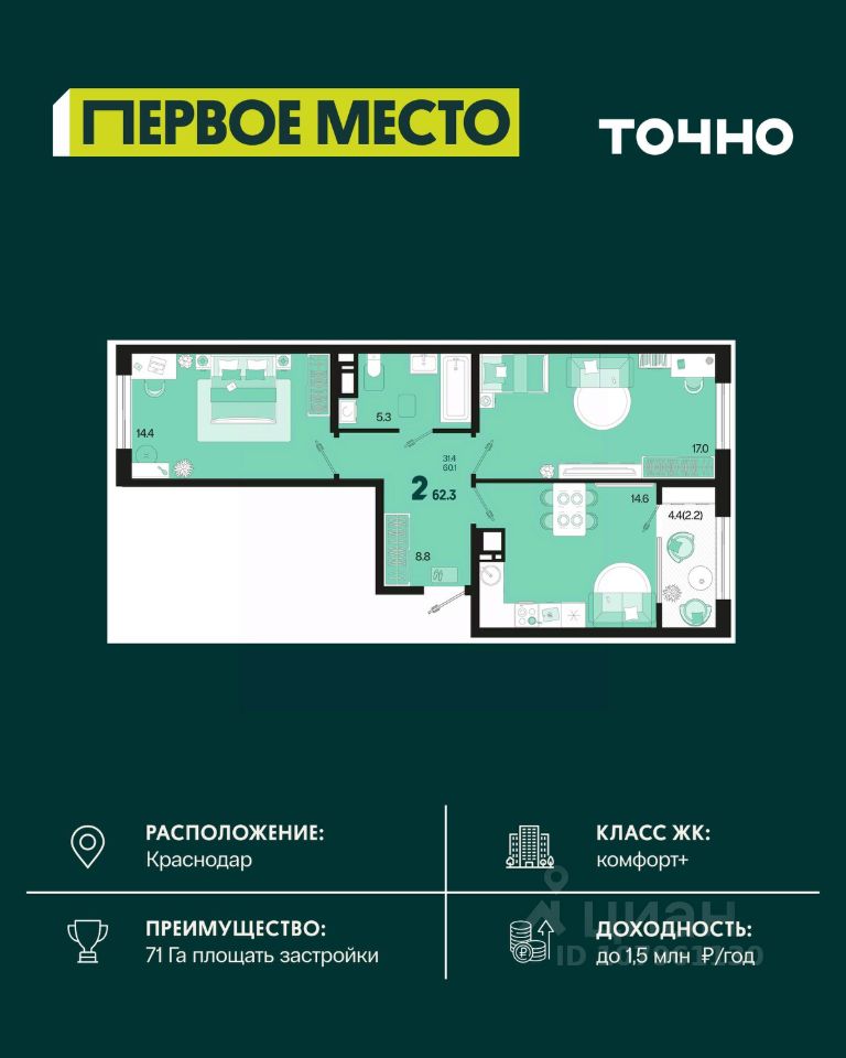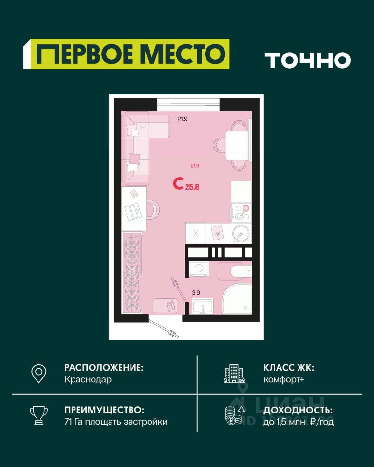 Продается 1 комнатная квартира площадью 39.1 кв. м. на 7 этаже 9 этажного дома, 1 подъезд, номер 58. Стоимость данного лота включает в себя ремонт, мебель и технику. Будут представлены 3 варианта обустройства квартиры: светлый, тонированный и авторский. Для более подробного ознакомления вы можете обратиться в отдел продаж. Жилой комплекс ''ИНАЧЕ в Молодежном'' включает в себя 14 домов комфорт+ класса переменной этажности с более чем 100 видами планировок, в том числе квартиры с террасами, двухуровневые квартиры и урбан виллы, детский сад на 350 мест, храм, 2 наземных паркинга, а также бульвар и прогулочные аллеи. Срок сдачи первой очереди 4 квартал 2026 года Жилой комплекс находится в Молодежном — тихом микрорайоне с атмосферой размеренной жизни. Рядом расположен зеленый сквер ''Изумрудный'' с зелеными деревьями и велодорожками. Молодежный — молодой район с готовой инфраструктурой. Всю бытовую и семейную можно легко организовать на расстоянии 10 минут от дома. Есть новая школа, два детских сада, поликлиника, работают магазины, аптеки и салоны красоты. Жилой комплекс расположен рядом с удобными выездами на ключевые городские дороги. Можно быстро доехать как в центр города, так и до моря по Ейскому шоссе. Главные чувства от прогулки по нашему району простота и легкость. Архитектуру мы проработали совместно с архитектурным бюро Маликова и создали район с современным лаконичным обликом. При этом мы учли сценарии жизни людей и современные тренды. В наших домах будут разноэтажные секции. Французские балконы и увеличенные окна. На фасадах не будет визуального шума: кондиционеры будут скрыты с специальных корзинах. По всей территории продумана безбарьерная сеть тротуаров и переходов. Любое перемещение — пешком или с коляской — станет комфортным. - На территории комплекса будут расположены детские и спортивные площадки, а также амфитеатр, арт-объект и храм. - 40% территории занимает озеленение с более чем 50 видами растений. - Хранить автомобиль с комфортом и беречь его от осадков помогут два наземных многоуровневых паркинга. Кроме крытых паркингов, на территории есть открытые — в достаточном числе для жителей и гостей района. - Проект включает в себя строительство современного детского сада и так же в пешей доступности находятся 2 школы. - На первых этажах мы создадим коммерческие помещения с планировками, которые помогают бизнесу. Умный проект коммерции включает удобные входные группы, высокие потолки и панорамные окна, приглашающие заглянуть внутрь. - Эстетика холла продолжает природную идею района. Дизайнерские холлы выполненные в натуральных цветах с живыми деревьями включают в себя места для ожидания, встреч, санузлы, колясочные и постаматы. - Система аудиомультирум в каждой квартир - распределение аудио- и видео-сигналов по всей квартире. Для более подробного ознакомления вы можете обратиться в отдел продаж.