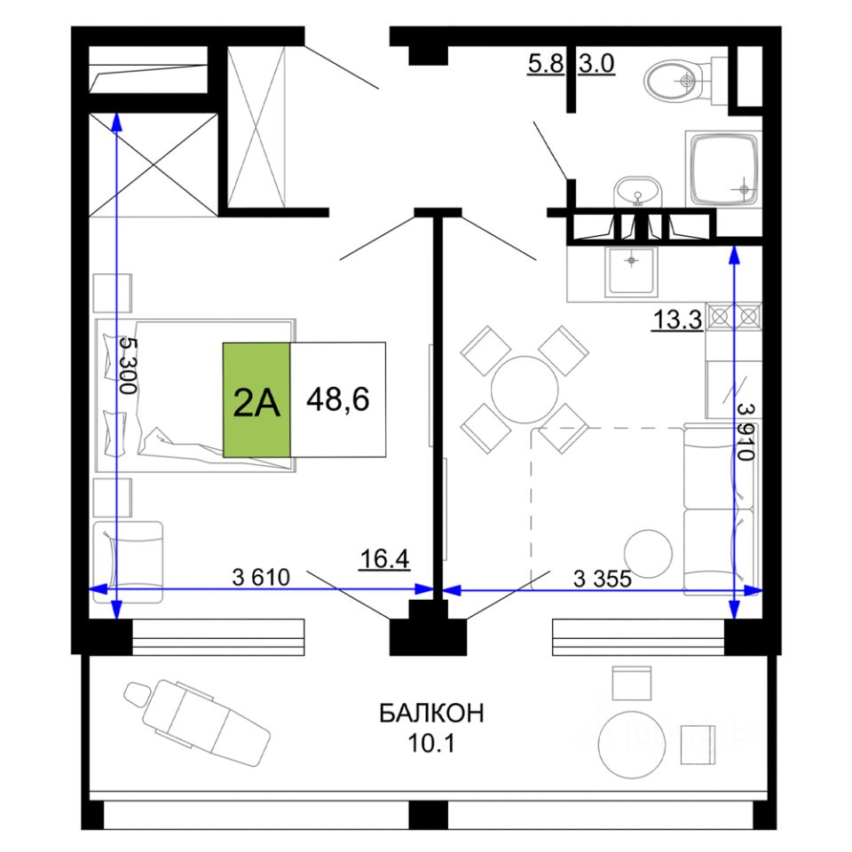 55 м² · Этаж 14 из 16