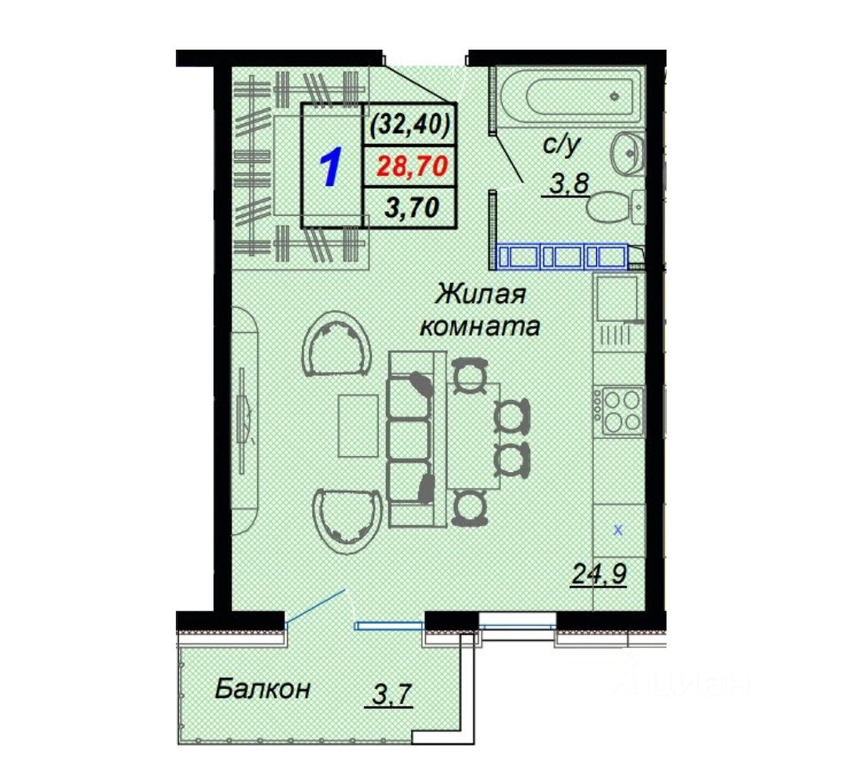 32 м² · Этаж 11 из 15