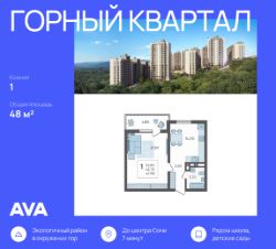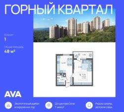 В продаже 1-комнатная квартира площадью 48, расположенная Литер 5 жилого комплекса комфорт+ класса ''Горный квартал''. Комплекс от девелопера AVA находится в Сочи, Хостинского района, в 15 минутах езды от центра города.Отличная транспортная доступность:Остановка маршрутных такси - 5 минут пешком,Барановский виадук - 10 минут на авто,Министерские озера - 2 минуты пешком,Гимназии, детские сады, фитнес-центры, супермаркеты, кинотеатр - 5-10 минут на авто,Ж/Д и автовокзал - 15-20 минут на авто,Адлер - 30 минут на авто,Аэропорт - 45 минут на авто.Аккуратный облик домовЖилой комплекс состоит из пяти корпусов высотой от 10 до 16 этажей. Сдержанные фасады в бежево-серых оттенках выглядят аккуратно и гармонируют с природным окружением, а открытые балконы добавляют облику домов легкости. Контейнеры под кондиционеры встроены в фасады и практически незаметны, благодаря чему дома сохраняют опрятный внешний вид. Комплекс расположен на склоне горы, поэтому из окон квартир на верхних этажах открываются отличные панорамные виды на лес, озеро и город: чем выше этаж, тем выразительнее пейзаж.Двор, где есть место для всехНа внутренней территории комплекса всем будет приятно и интересно проводить время в любой сезон. Здесь есть беседки и гамаки под теневыми навесами, что особенно удобно для отдыха в жаркие или дождливые дни. Для активных жителей предусмотрены спортивные площадки и уличные тренажеры, для детей - игровые площадки из натуральных материалов, а для семей и компаний - зона барбекю. Особое преимущество - кинотеатр под открытым небом: формат редкий для жилых комплексов и особенно ценный для совместного семейного досуга прямо рядом с домом. Во всем дворе - ландшафтное озеленение: высажены разнообразные деревья и кустарники, южные цветы и газоны.Природное окружение и идеальная экологияЛокация особенно понравится тем, кто любит природу и ведет активный образ жизни. Всего в 2 минутах ходьбы находится Нижнее Министерское озеро - отличное место для прогулок и отдыха. Поблизости расположены природные достопримечательности южного побережья, включая Черепашье озеро и дольмены, куда интересно ходить в походы или выезжать на выходные. До общественных и санаторных пляжей можно добраться за 20 минут на автомобиле. Благодаря хвойному лесу и мягкому морскому бризу здесь всегда чистый воздух, а ночами видно звездное небо, что подчеркивает горный характер места и создает редкое ощущение тишины и уюта для Сочи.Дополнительные преимуществаВидовые квартиры с окнами на три стороны света и семейные форматы с тремя спальнями, двумя ванными и отдельной кухней,Наземный паркинг для жителей и гостей на 815 машиномест,На первых этажах домов работают магазины, рестораны и салоны красоты, к которым можно спуститься на лифте,Комфортно не только отдыхать, но и полноценно жить всей семьей: гимназии в 10 минутах езды, удобная дорогая до города, магазины и сервисы поблизости.