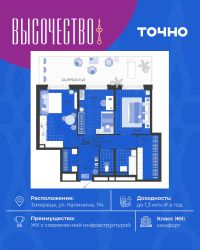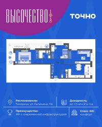 ''Высочество'' — первый ЖК комфорт-класса в Тихорецке. Современные технологии, новейшие представления о комфорте и эргономике жилья -это, то, что характеризует этот комплекс. Расположен в самом центре города. ''Высочество'' — это полностью самостоятельный жилой комплекс, жителей которого порадуют закрытый и свободный от машин двор, коммерческая галерея, спортивные и детские площадки с перголами для отдыха, уютная мангальная зона. По периметру жилого комплекса - открытый бесплатный паркинг на 370 м/мест. Недалеко от ЖК ''Высочество'' находятся детский сад, школы-гимназии, поликлиника, торговый центр, в пешей доступности расположен любимый сквер жителей города ''Звездный''.