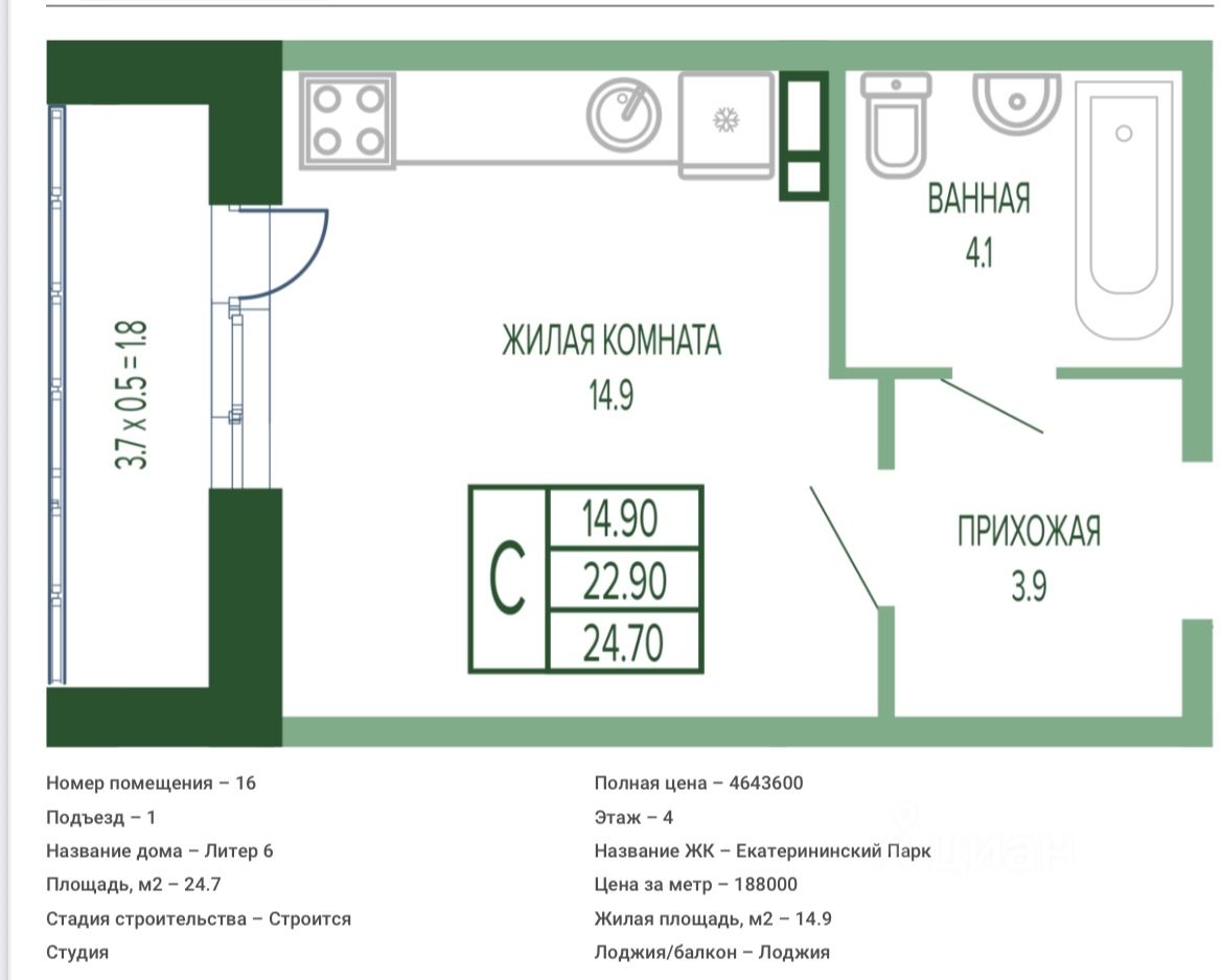 Продается студия-комнатная квартира во второй очереди жилого комплекса ''Екатерининский парк''. Это роскошный проект бизнес-класса от СК ''ЕкатеринодарИнвест-Строй'', строящийся в Фестивальном микрорайоне Краснодара, рядом с ''Полем Чудес''. Площадь 24,7 кв.м. на 15 этаже. 15и-этажный литер 5 - это высотная доминанта комплекса. Авторская, лаконичная архитектура домов воплощена в элегантной баварской кладке из кирпича по технологии клинкер. Снаружи дома зеленый двор-парк в стиле Японского сада. В комплексе предусмотрена собственная инфраструктура 2 частных детских сада, отдельный фитнес-центр для жильцов и коммерческая галерея. Территория ЖК безопасна и приватна закрыта по периметру, оснащена системой видеонаблюдения без ''слепых зон'', а доступ в подъезд осуществляется через систему видеодомофонов или через мобильное приложение.