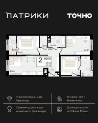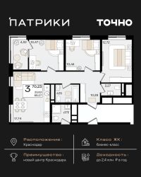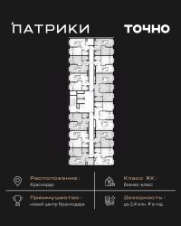 Флагманский проект группы компаний Точно - жилой комплекс бизнес-класса Патрики, это 10 домов разной этажности расположившихся на 28,5 гектарах. Жилой комплекс с концепцией город в город - прогулочные аллеи, парковая территория, 3 детских сада, 2 школы - одна из которых частная, Гранд аллея с ресторанами, фонтанами и модными бутиками, уникальные мафы и ландшафтный дизайн, создают особую атмосферу - место в котором хочется находиться. В Патриках предусмотрен и креативный кластер Цех, который включает в себя пространство для коворкинга, фудкорт, бутики, детский комплекс, лектории, фитнес-клуб Баланс с волной для сёрфа. Но и это еще не все ГК Точно уважает историю, поэтому мы сохранили 2 башни - наследство от завода ''Сельмаш'' исторический арт-объект назвали Мастер и Маргарита.