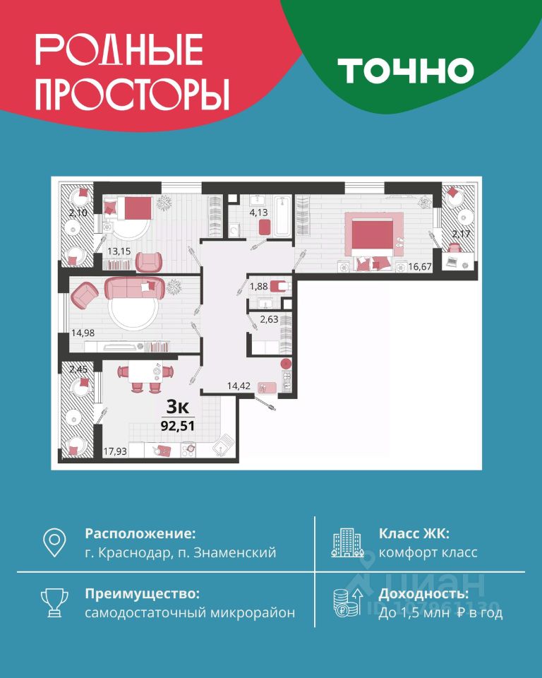 Микрорайон ''Тёплые края'' — это масштабный проект комплексного освоения территории. Жилой комплекс воплотил в себе все самые высокие критерии отбора квартиры по планировочным решениям, благоустройству и инфраструктуре. Преимущества, которые действительно важны: Комфорт и качество: • Монолитно-кирпичные дома с шумо- и теплоизоляцией. • Высокие потолки до 4,2 м, панорамные окна, функциональные планировки. • Предчистовая или чистовая отделка — можно сразу заехать или реализовать свой дизайн. Безопасные дворы без машин, видеонаблюдение, закрытая территория. Благоустройство: • Более 65 000 м² зелёных зон, скверы, аллеи, прогулочные бульвары. • 40 000 м² детских и спортивных площадок — от workout-зон до игровых городков. • Зоны отдыха и барбекю — идеальны для встреч с друзьями и семейных вечеров. Всё рядом: • Собственная школа на 1 800 мест и 3 детских сада на 950 мест. • Поликлиника, аптеки, магазины, кафе и пекарни в шаговой доступности. • Свой торгово-развлекательный центр, фитнес-клуб, фермерский рынок. Удобное расположение: • Район с чистым воздухом, рядом природа и река Кубань. • 15 минут до центра Краснодара и выезда на трассу в сторону моря. • Развитое транспортное сообщение — маршрутки, автобусы, удобные дороги. Выгодные условия покупки: • Семейная ипотека от 2,5%. • IT ипотека - 6%. • Возможность покупки по господдержке и с использованием маткапитала. • Рассрочка с удобным графиком платежей. • Высокий потенциал роста стоимости жилья. Почему ''Тёплые края'' — лучший выбор: • Район строится по принципу ''город в городе'': всё для жизни внутри. • Комфортный баланс между городским ритмом и уютом пригорода. • Идеально подходит и для жизни, и для инвестиций. СК Семья входит в топ-5 среди застройщиков Краснодарского края. Надёжная компания с десятками реализованных проектов. Звоните — поможем Вам сделать правильный выбор и подобрать лучший вариант под ваш бюджет и цели.