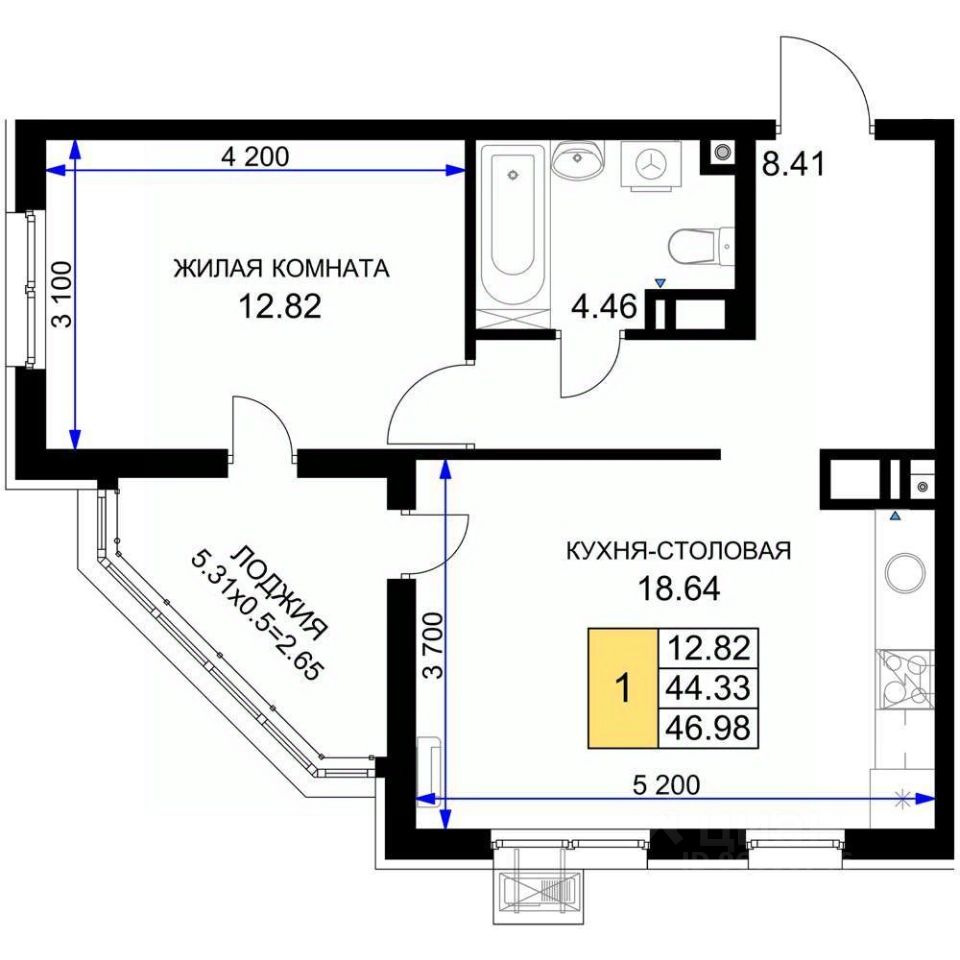 Продается 1-комн. квартира, площадью 46.98 м2. Возможен вариант покупки с использованием ипотечных средств. Жилая площадь 12.82 кв. м, кухня 18.64 кв. м, типовой ремонт, комнаты изолированные. Квартира располагается на 13 этаже 18-этажного монолитно-кирпичного дома, высота потолков 2.82 м. Дом оборудован пассажирским лифтом, закрытая территория, парковка охраняется.