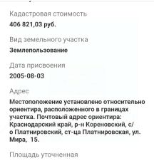 Арт. 97714329 лот #97714329нтПродается земельный участок 15 соток в ст. Челбасской Каневского района. Участок имеет фасад 20 метров, в глубину - 70 метров, что позволит разместить на нем все, что вы хотите. Здесь можно построить дом или заниматься огородничеством и разведением домашних животных.Челбасская - крупная станица в Каневском районе Краснодарского края, расположенная на реке Средняя Челбаска, в 109 километрах к северу от краевого центра - города Краснодара. Станица достаточно развита, имеет население 8 тысяч человек. Здесь есть школа, детский сад, больница, магазины, кафе, аптеки. С автостанции населенного пункта регулярно отправляются автобусы в город Краснодар, Каневскую, Брюховецкую, Тимашевск, Кореновск, Пластуновскую, Динскую. В станице есть действующие сельхозпредприятия.Рядом со станицей (6 км.) расположен уникальный памятник природы - Челбасский лес размером около 1500 гектаров. Этот лес был высажен в конце 19 века - это легкие северной части Краснодарского края. Здесь произрастают как распространенные, так и редкие виды деревьев, высаживается множество лекарственных трав. Лес разнообразен не только флорой, но и фауной, здесь водятся: лоси, дикие кабаны, лисы, фазаны и другие представители животного мира. Это уникальное место для вашего отдыха и единения с природой.Звоните для консультации и подробностей! Межевание участка проведено, документы готовы к сделке.