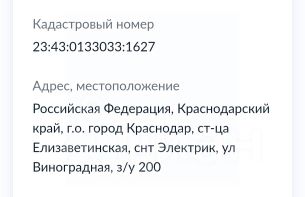 Ваш участок у города, но в природной гармонии! Краснодарская прописка.Торт, срочная продажа , я собственник. Адрес: г. Краснодар, ст. Елизаветинская, НСТ ЭЛЕКТРИК, ул. Виноградная, 200.Не упустите шанс создать родовое гнездо всего в шаге от динамичной жизни Краснодара! Предлагается идеальный чистый участок для тех, кто ценит простор, тишину и перспективы. Ключевые преимущества: Идеальная основа: Участок правильной прямоугольной формы с фасадом 23 метра, готов к проектированию без сложностей. Межевание проведено — границы четкие, спорные вопросы исключены. Полная готовность к строительству: Земля абсолютно чистая — нет старых строений или вековых деревьев, требующих вырубки. Можно сразу приступать к работам вашей мечты. Комфортная инфраструктура: К поселку ведет хорошая подъездная дорога. Остановка рядом — ходят маршрутки и школьный автобус, что важно для семьи. 100% Краснодарская прописка: Оформляйте официальную регистрацию по адресу участка, оставаясь жителем краевого центра. Коммуникации — старт уже дан: Электричество на границе! Столб стоит прямо у участка — подключение быстрое и экономичное. Центральное водоснабжение доступно для подключения. Газ — в ближайшей перспективе! Уже в проекте на 2 года. Соседи активно готовят документы, создавая общее подключение — присоединяйтесь к процессу. Идея для жизни: Это отличное место, где будущее начинается сегодня. Постройте просторный дом для семьи, наслаждайтесь свежим воздухом и тишиной, не отрываясь от благ цивилизации и работы в городе. Звоните прямо сейчас! Узнайте все детали и договоритесь о просмотре этого перспективного участка. Это инвестиция в спокойное, комфортное и ценное будущее!P.S. Участки с такими параметрами и в такой локации — редкость. Это шанс создать свой уголок с нуля, в растущем и развивающемся сообществе. Соседний участок (1628) так же продается. Для тех, кто мечтает о большом участке или ищет равные варианты для детей!