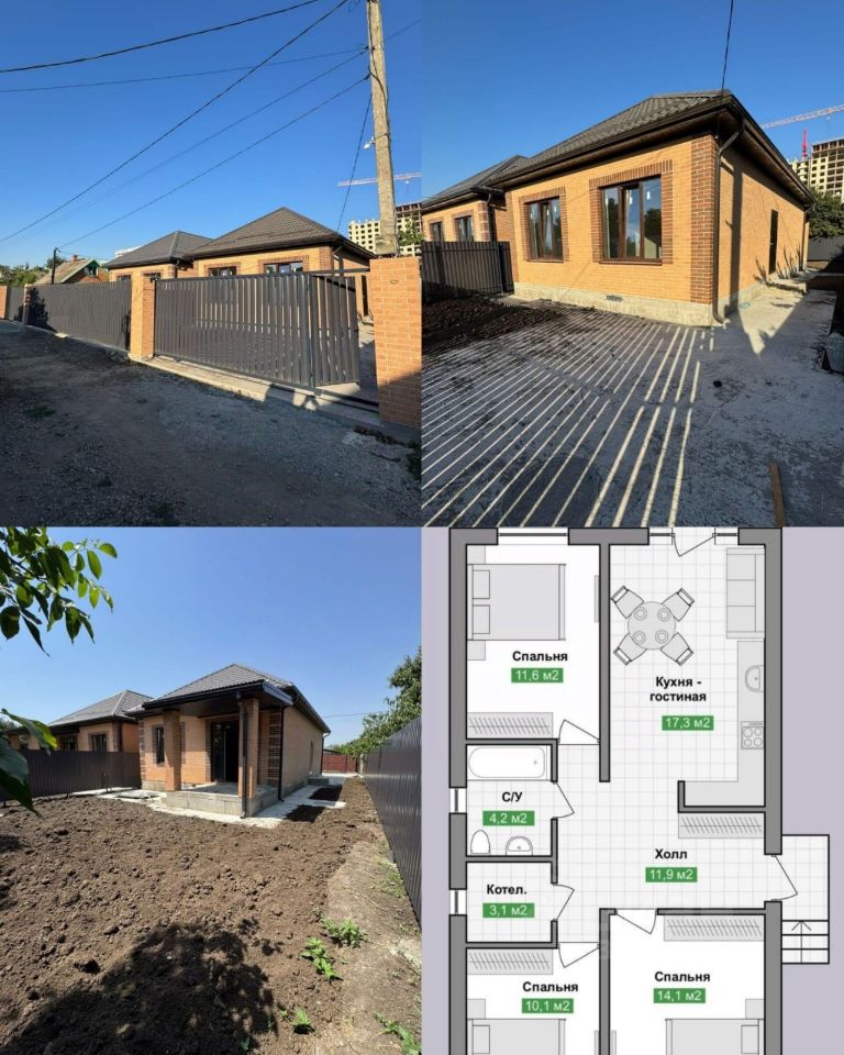 Продается комфортный современный дом площадью 120м2, расположенный на земельном участке в 4 сотки.В доме есть все необходимые коммуникации: скважина (водоснабжение), септик (ЛОС), отопление (тёплый пол), электричество 15 кВт (3 фазы), Газ по границе участка. 3 спальни, кухня - гостинная с выходом на террасу заднего двора, объединённый с/у, котельная. Автоматические ворота, парковка на 2 автомобиля. Будет выполнена внутренняя отделка ''под чистовую''. Дом расположен в закрытом поселке Верхний Казачий Хутор (в 10 минутах ходьбы до ОЗ МОЛЛ). В самом поселке имеется вся инфраструктура: футбольное поле, волейбольная площадка, детская игровая площадка, в шаговой доступности магазины, аптеки, пекарня, автобусные остановки. Городская прописка. Возможна рассрочка, ипотека, кредит, материнский капитал. Дом можно посмотреть в любой день. Для этого напишите нам или свяжитесь по номеру Фото - видео фиксация поэтапного строительства будет предоставлена покупателю.