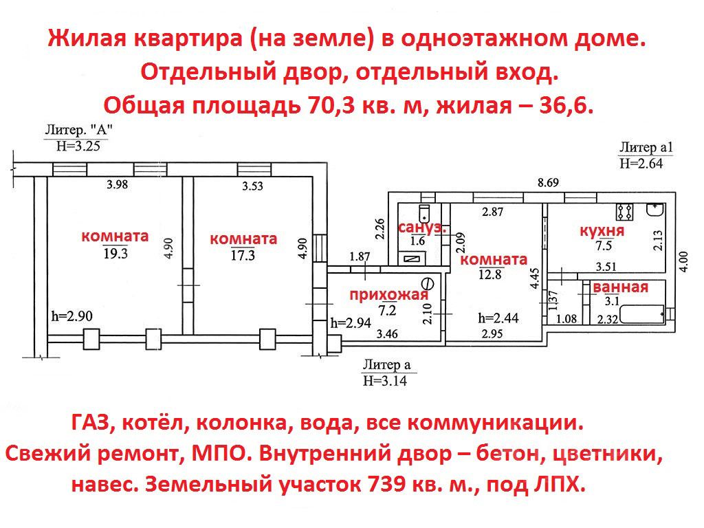 Станица Тбилисская. ЦЕНТР. Коттедж на 3 хозяина в одноэтажном доме по улице Октябрьской. Общая площадь 70,3 кв. м, жилая 36,6. Отдельный двор и вход. Три комнаты (19,3+17,3+12,8), кухня 7,5 кв. м., раздельный санузел 3,2, прихожая 7,2 кв. м. Высота помещений 2,90 м. Квартира газифицирована, есть газовые котёл и колонка, вода, все коммуникации. Свежий ремонт, МПО. Внутренний двор бетон, цветники, навес. Земельный участок 739 кв. м., под ЛПХ. Тихий, уютный дворик. В шаговой доступности вся инфраструктура станицы. Цена: 7 млн. ТОРГ. P.S.: Станица Тбилисская - административный центр Тбилисского района Краснодарского края. Расположена в центральной части Краснодарского края, на правом берегу реки Кубань, в 100 км на северо-восток от Краснодара, и на высоте около 102105 метров над уровнем моря. Протяжённость станицы с запада на восток около 10 километров. Население около 25 317 жителей. В станице весьма развита инфраструктура. В ней есть дошкольные учреждения, общеобразовательные школы, а так же церковно-приходская школа и школа искусств, библиотеки, кинотеатр, клубы, различные секции и кружки, коллективы народной самодеятельности, стадионы. Работает филиал МФЦ. На территории станицы действуют несколько крупных сельскохозяйственных и перерабатывающих предприятий: Тбилисский маслосырзавод, Тбилисский сахарный завод, маслопрессовый завод, предприятие по производству комбинированных кормов, семенной завод, завод Центр Соя, элеватор. Развита сеть торговых супермаркетов. В Тбилисской находятся два православных прихода Тихорецкой епархии Кубанской митрополии Русской Православной Церкви. Это Свято-Покровский храм и Храм святого апостола Андрея Первозванного. По северной окраине станицы проходит автомобильная дорога регионального значения Р251 Темрюк Краснодар Кропоткин, которая соединяет федеральные автодороги М4 Дон, и М29 Кавказ. В центре станицы расположена автостанция через которую проходят транзитные междугородные автобусные маршруты, а также автобусные маршруты местного назначения. В станице расположена и железнодорожная станция Гречишкино на линии Краснодар Кавказская, Северо-Кавказской железной дороги. В станице действует 5 автобусных маршрутов, также существует несколько служб такси. Расстояние до крупнейших и ближайших городов (по автодорогам) Кропоткин 33 км. Краснодар 108 км. Майкоп 134 км. Армавир 107 км. Ставрополь 198 км. Ростов-на-Дону 257 км. Москва 1 309 км. до Азовского моря (г.Ейск) 260 км. до Черного моря: Анапа 278 км. Джубга 205 км. Новороссийск 270 км. Симферополь 549 км. Сочи 354 км.
