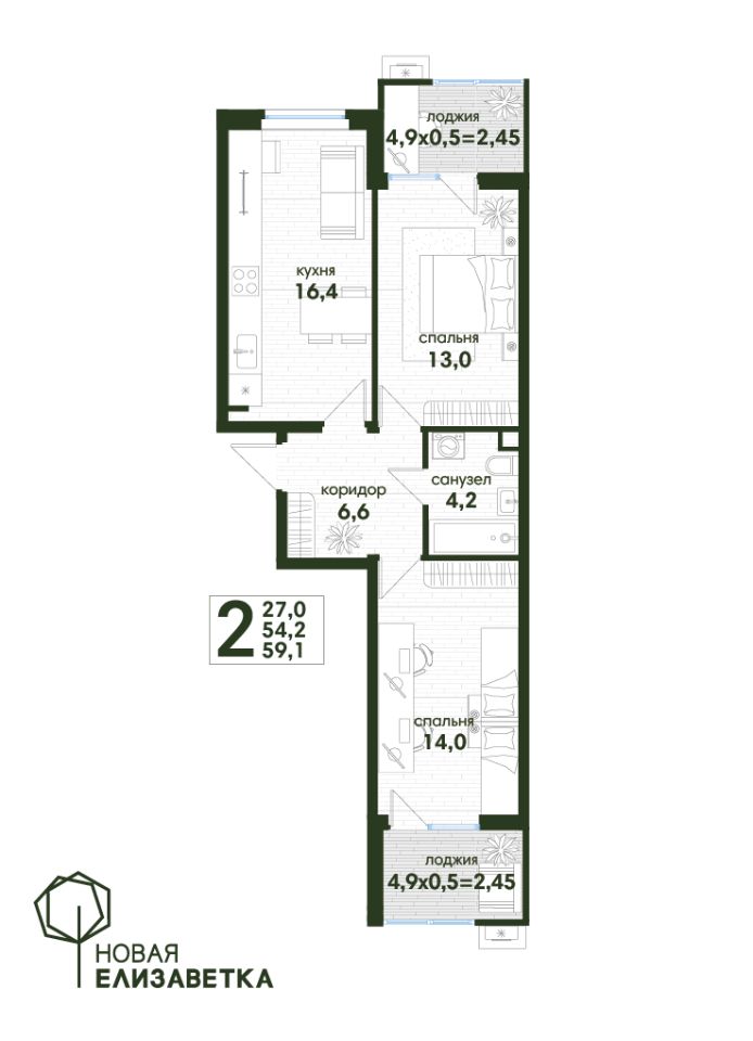 Общая площадь59,1 м2