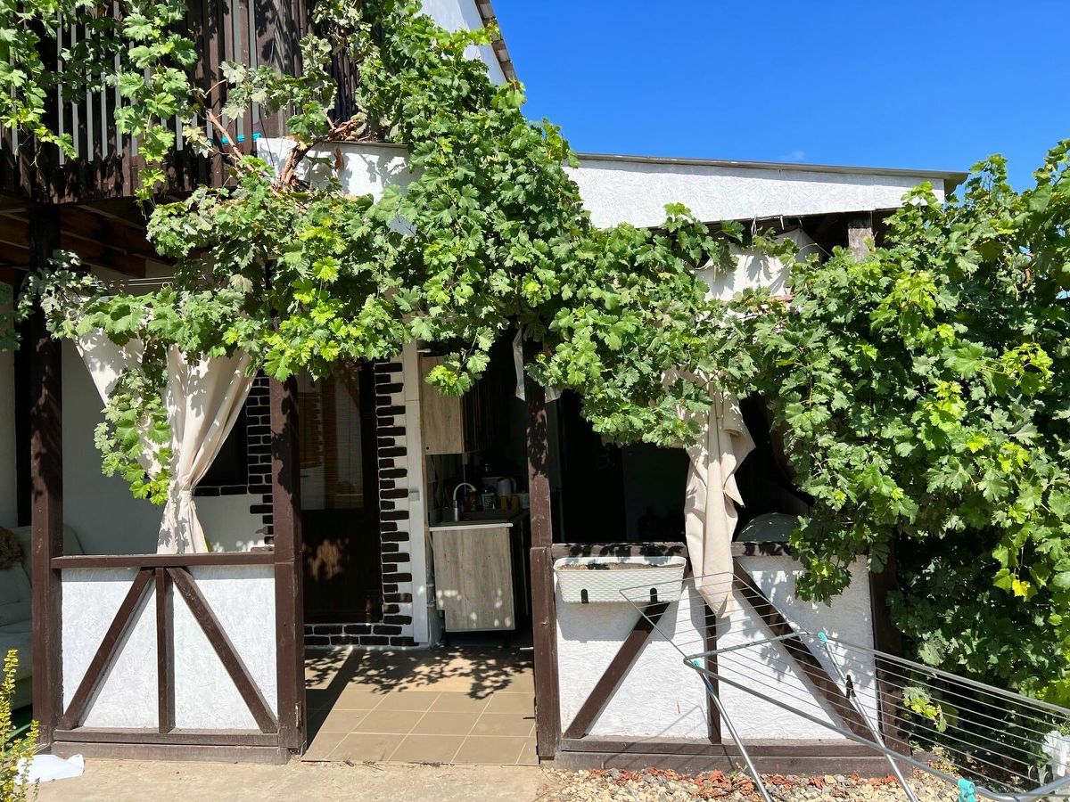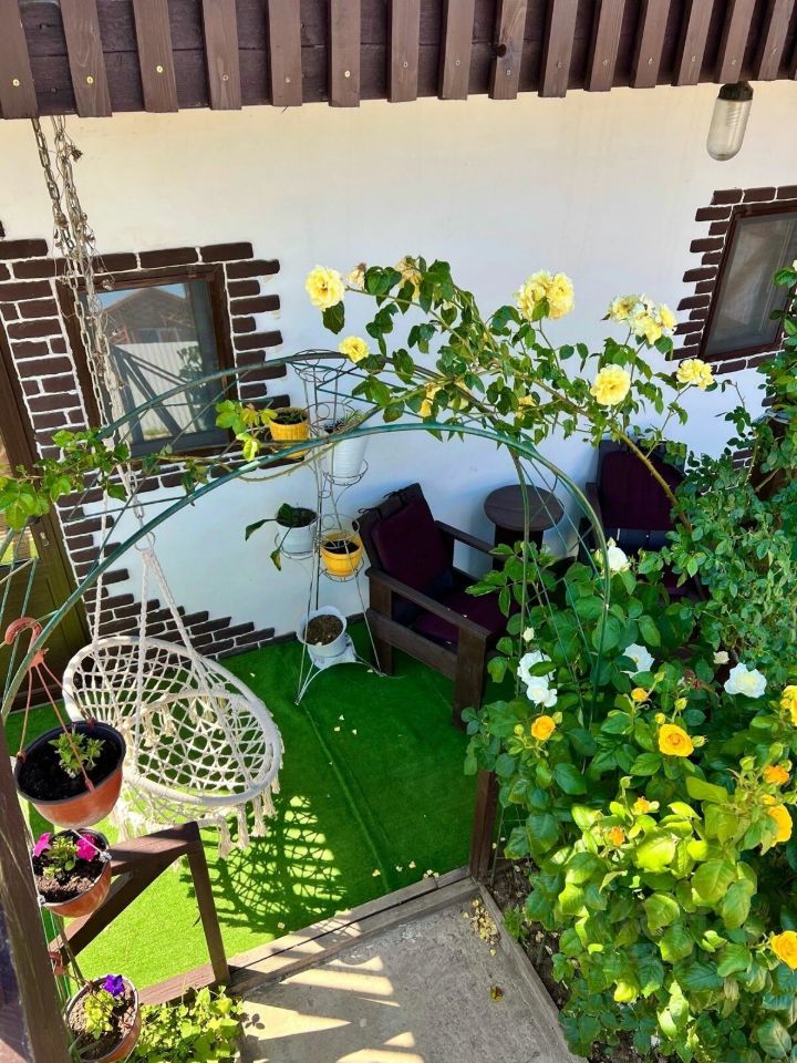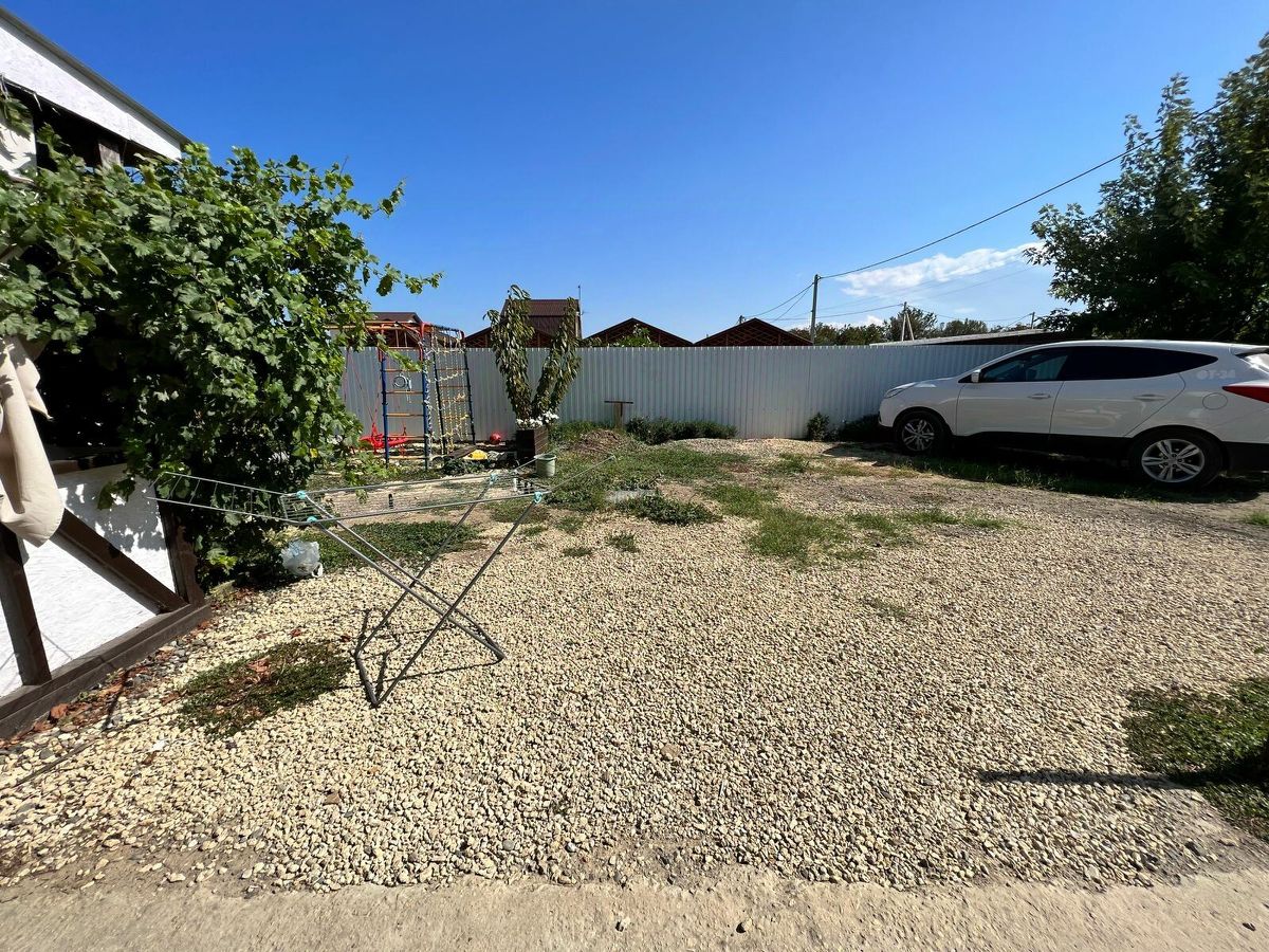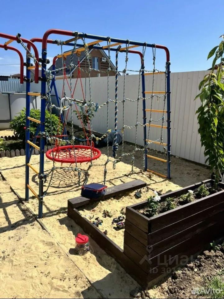 Участок ровный, правильной формы и широкий фасад. Здесь оборудована детская игровая зона с песочницей, качелями и турником, на лето устанавливается каркасный бассейн, а также есть мангальная зона. На территории растут плодовые деревья: инжир, слива, груша, гранат, две черешни, яблоня и шесть сортов винограда.