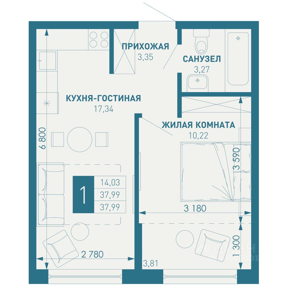 Общая площадь37,99 м2