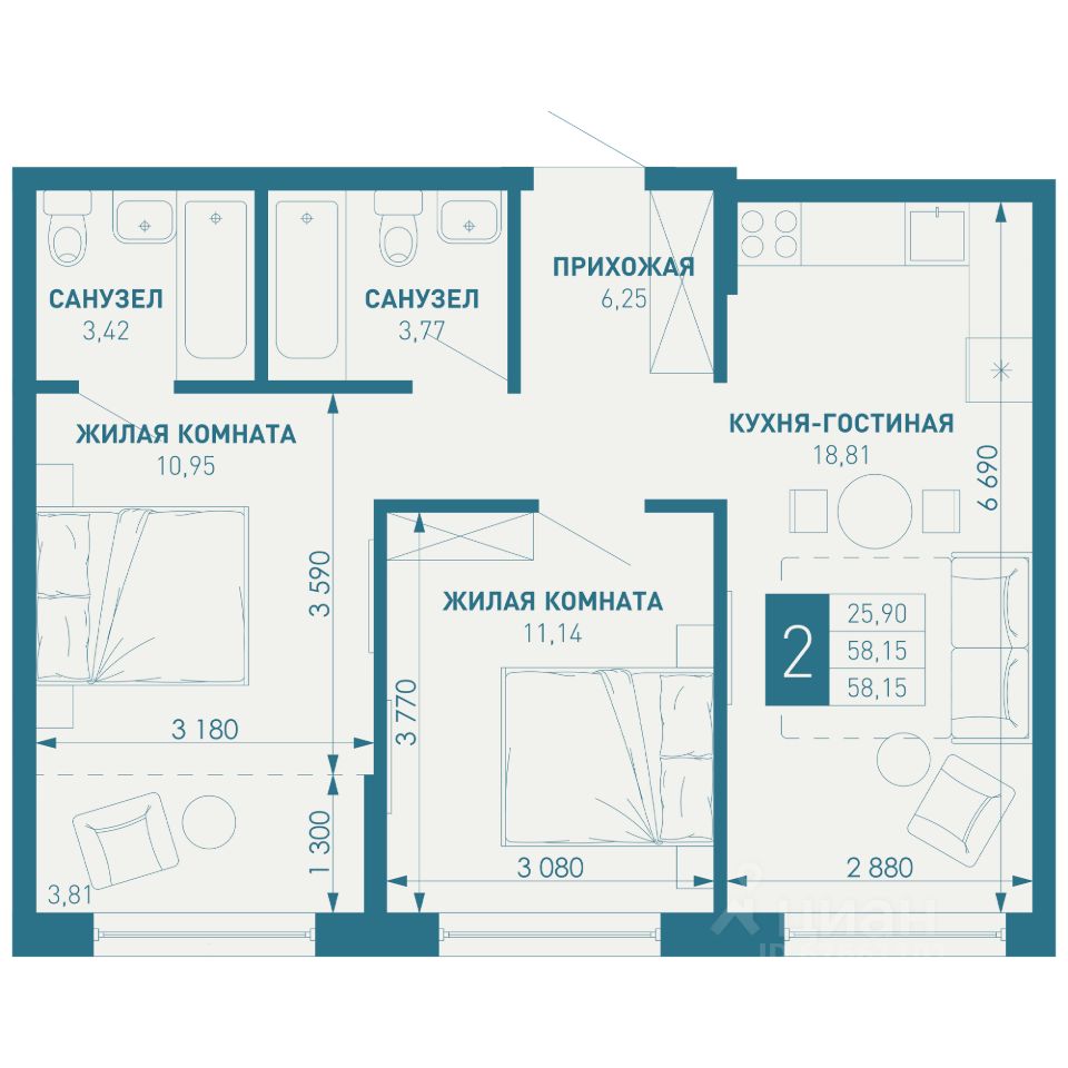 Общая площадь58,15 м2
